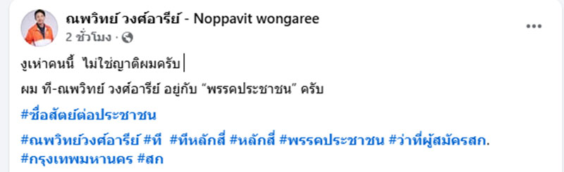 ล่าสุด นายณพวิทย์ วงศ์อารีย์ ว่าที่ผู้สมัคร ส.ก.เขตหลักสี่ กรุงเทพมหานคร โพสต์เฟซบุ๊กระบุว่า “งูเห่าคนนี้ ไม่ใช่ญาติผมครับ ผม ที-ณพวิทย์ วงศ์อารีย์ อยู่กับพรรคประชาชนครับ”
