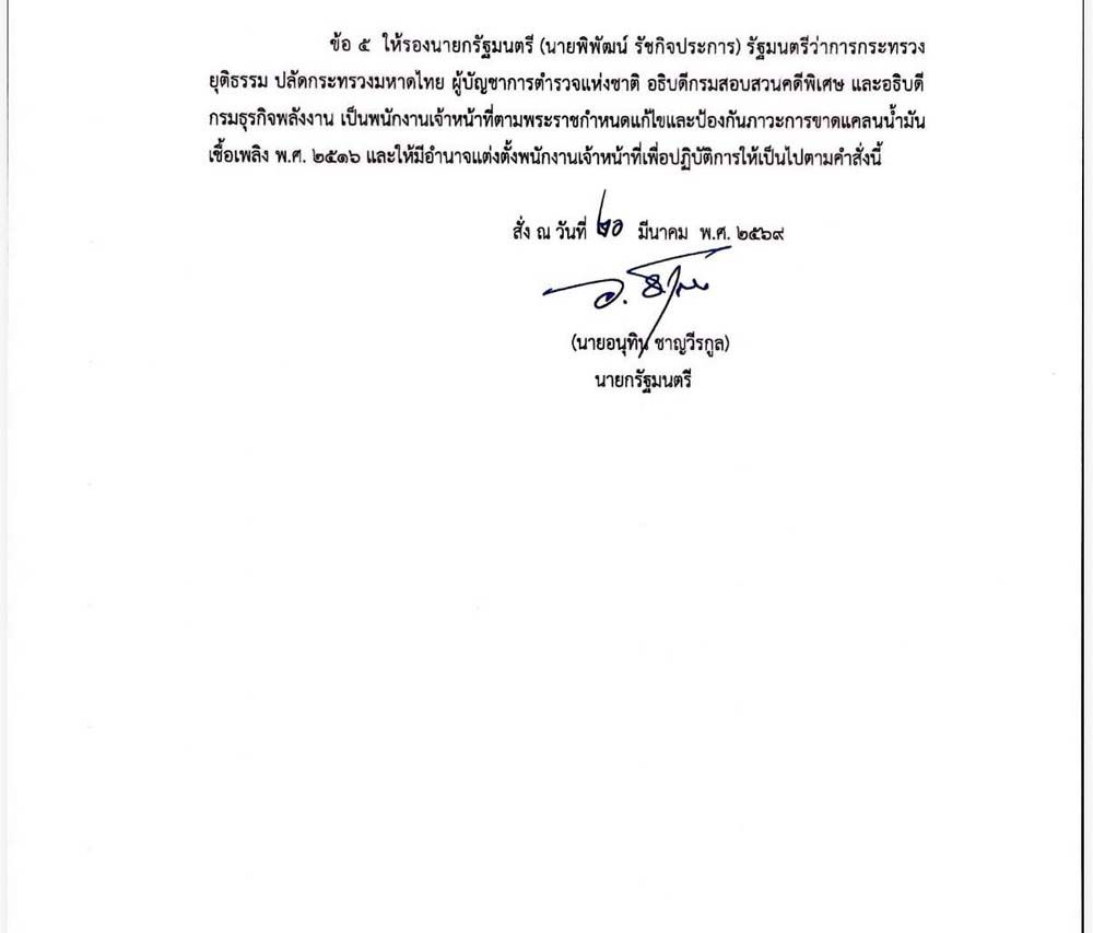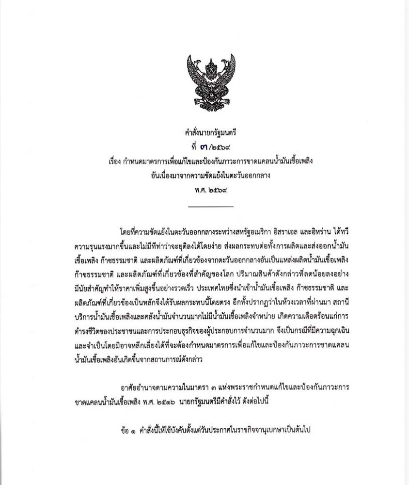 วันที่ 20 มีนาคม 2569 ผู้สื่อข่าวรายงานว่า นายอนุทิน ชาญวีรกูล นายกรัฐมนตรี และรมว.มหาดไทย ลงนามคำสั่งนายกรัฐมนตรี ที่ 3/2569 เรื่อง กำหนดมาตรการเพื่อแก้ไขและป้องกันภาวะการขาดแคลนน้ำมันเชื้อเพลิงอันเนื่องมาจากความขัดแย้งในตะวันออกกลาง พ.ศ.2569 โดยระบุว่าโดยที่ความขัดแย้งในตะวันออกกลางระหว่างสหรัฐอเมริกา อิสราเอล และอิหร่าน ได้ทวีความรุนแรงมากขึ้นและไม่มีทีท่าว่าจะยุติลงได้โดยง่าย ส่งผลกระทบต่อทั้งการผลิตและส่งออกน้ำมันเชื้อเพลิง ก๊าซธรรมชาติ และผลิตภัณฑ์ที่เกี่ยวข้องจากตะวันออกกลางอันเป็นแหล่งผลิตน้ำมันเชื้อเพลิง ก๊าซธรรมชาติ และผลิตภัณฑ์ที่เกี่ยวข้องที่สำคัญของโลก ปริมาณสินค้าดังกล่าวที่ลดน้อยลงอย่าง มีนัยสำคัญทำให้ราคาเพิ่มสูงขึ้นอย่างรวดเร็ว ประเทศไทยซึ่งนำเข้าน้ำมันเชื้อเพลิง ก๊าซธรรมชาติ และผลิตภัณฑ์ที่เกี่ยวข้องเป็นหลักจึงได้รับผลกระทบนี้โดยตรง อีกทั้งปรากฏว่าในห้วงเวลาที่ผ่านมา สถานีบริการน้ำมันเชื้อเพลิงและคลังน้ำมันจำนวนมากไม่มีน้ำมันเชื้อเพลิงจำหน่าย เกิดความเดือดร้อนแก่การดำรงชีวิตของประชาชนและการประกอบธุรกิจของผู้ประกอบการจำนวนมาก จึงเป็นกรณีที่มีความฉุกเฉินและจำเป็นโดยมิอาจหลีกเลี่ยงได้ที่จะต้องกำหนดมาตรการเพื่อแก้ไขและป้องกันภาวะการขาดแคลนน้ำมันเชื้อเพลิง อันเกิดขึ้นจากสถานการณ์ดังกล่าว อาศัยอำนาจตามความในมาตรา 3 แห่งพระราชกำหนดแก้ไขและป้องกันภาวะการขาดแคลนน้ำมันเชื้อเพลิง พ.ศ. 2516 นายกรัฐมนตรีมีคำสั่งไว้ ดังต่อไปนี้