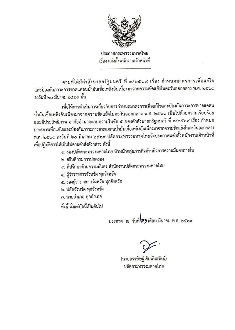 วันที่ 21 มีนาคม 2569 นายอรรษิษฐ์ สัมพันธรัตน์ ปลัดกระทรวงมหาดไทย เปิดเผยถึงการดำเนินการตามคำสั่งนายกรัฐมนตรี ที่ 3/2569 เรื่อง กำหนดมาตรการเพื่อแก้ไขและป้องกันภาวะการขาดแคลนน้ำมันเชื้อเพลิงอันเนื่องมาจากความขัดแย้งในตะวันออกกลาง พ.ศ. 2569 ลงวันที่ 20 มีนาคม 2569 ซึ่งได้มอบหมายให้นายพิพัฒน์ รัชกิจประการ รองนายกรัฐมนตรี และรมว.คมนาคม รัฐมนตรีว่าการกระทรวงยุติธรรม ปลัดกระทรวงมหาดไทย ผู้บัญชาการตำรวจแห่งชาติ อธิบดีกรมสอบสวนคดีพิเศษ และอธิบดีกรมธุรกิจพลังงาน ติดตามตรวจสอบการดำเนินงานของผู้ค้าน้ำมันตามมาตรา 7 แห่งพระราชบัญญัติการค้าน้ำมันเชื้อเพลิง พ.ศ. 2543 และผู้ค้าน้ำมันตามมาตรา 10 แห่งพระราชบัญญัติการค้าน้ำมันเชื้อเพลิง พ.ศ. 2543 และให้เป็นพนักงานเจ้าหน้าที่ตามพระราชกำหนดแก้ไขและป้องกันภาวะการขาดแคลนน้ำมันเชื้อเพลิง พ.ศ. 2516 และให้มีอำนาจแต่งตั้งพนักงานเจ้าหน้าที่เพื่อปฏิบัติการให้เป็นไปตามคำสั่งนี้