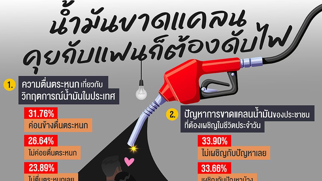 เมื่อวันที่ 22 มีนาคม 2569 ศูนย์สำรวจความคิดเห็นนิด้าโพล สถาบันบัณฑิตพัฒนบริหารศาสตร์ (นิด้า) เปิดเผย ผลการสำรวจ เรื่อง “น้ำมันขาดแคลนคุยกับแฟนก็ต้องดับไฟ” ทำการสำรวจระหว่างวันที่ 17 - 18 มีนาคม 2569 จากประชาชนที่มีอายุ 18 ปีขึ้นไป กระจายทุกภูมิภาค ระดับการศึกษา อาชีพ และรายได้ ทั่วประเทศ รวมจำนวนทั้งสิ้น 1,310 หน่วยตัวอย่าง เกี่ยวกับวิกฤตการณ์น้ำมันในประเทศ การสำรวจอาศัยการสุ่มตัวอย่างโดยใช้ความน่าจะเป็น จากบัญชีรายชื่อฐานข้อมูลตัวอย่างหลัก (Master Sample) ของ “นิด้าโพล” สุ่มตัวอย่างแบบหลายขั้นตอน (Multi-stage Sampling) เก็บข้อมูลด้วยวิธีการสัมภาษณ์ทางโทรศัพท์ โดยกำหนดค่าความคลาดเคลื่อนไม่เกิน 0.05 ที่ระดับความเชื่อมั่น ร้อยละ97.0