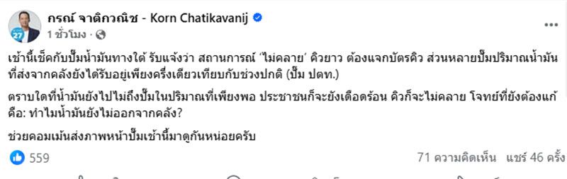วันที่ 23 มีนาคม 2569 นายกรณ์ จาติกวณิช รองหัวหน้าพรรคประชาธิปัตย์(ปชป.)และสส.แบบบัญชีรายชื่อ โพสต์เฟซบุ๊ก “กรณ์ จาติกวณิช – Korn Chatikavanij” ระบุว่า เช้านี้เช็คกับปั๊มนํ้ามันทางใต้ รับแจ้งว่า สถานการณ์ ‘ไม่คลาย’ คิวยาว ต้องแจกบัตรคิว ส่วนหลายปั๊มปริมาณนํ้ามันที่ส่งจากคลังยังได้รับอยู่เพียงครึ่งเดียวเทียบกับช่วงปกติ (ปั๊ม ปตท.)