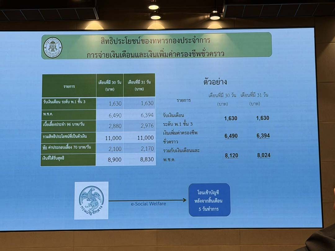 พล.ต.เทอดศักดิ์ วงจันทร์ เจ้ากรมการเงินทหารบก กล่าวว่า สิ่งที่ทหารใหม่กองประจําการจะได้รับ แบ่งเป็น เงินเดือน 1,630 บาท ค่าครองชีพ 6,490 บาท เบี้ยเบี้ยเลี้ยงประจํา 96 บาท/วัน รวมสิทธิประโยชน์ที่เป็นตัวเงิน 11,000 บาท หักค่าประกอบเลี้ยง 70 บาท/วัน (3 มื้อ) รวมเงินสุทธิ 8,900 บาท
