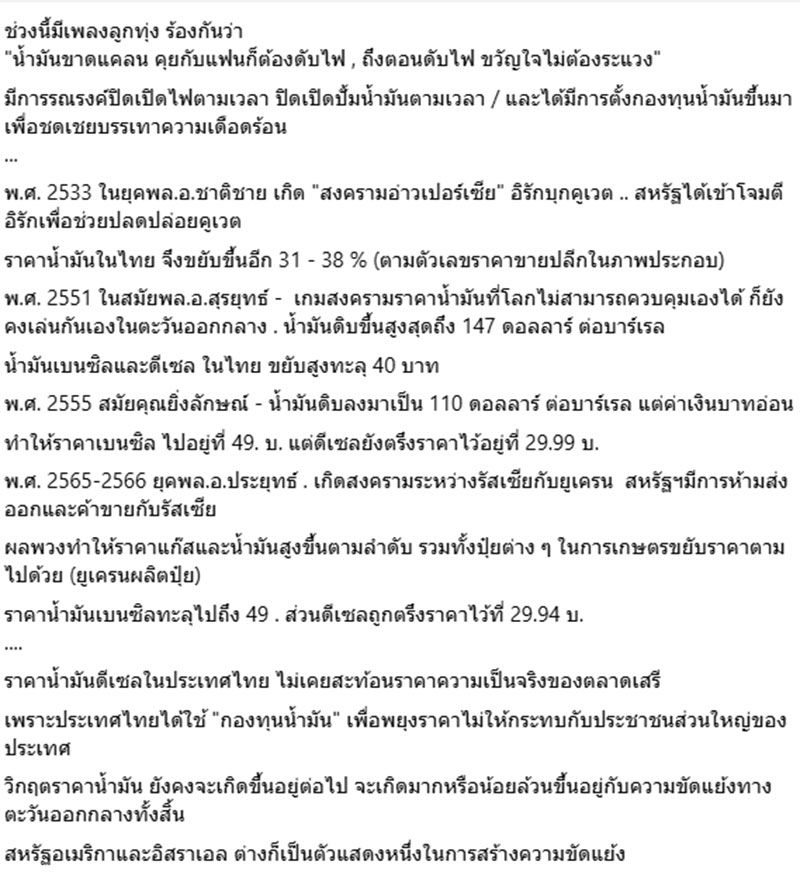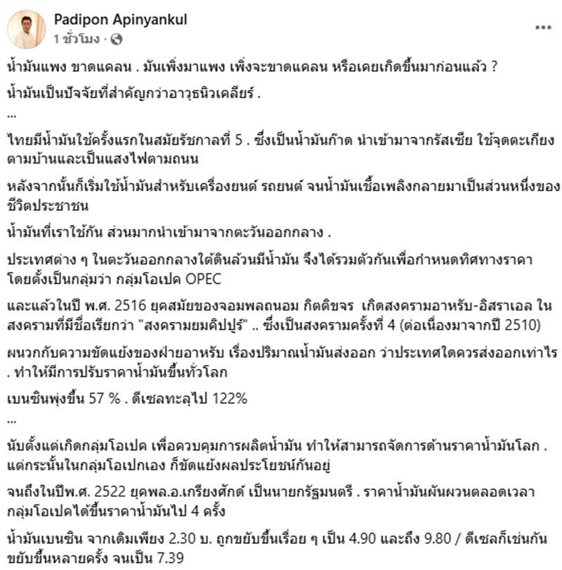 วันที่ 19 มีนาคม 2569 นายปฏิพล อภิญญาณกุล นักเขียนชื่อดัง ได้โพสต์ข้อความลงบนเฟซบุ๊ก "Padipon Apinyankul" ระบุว่า น้ำมันแพง ขาดแคลน . มันเพิ่งมาแพง เพิ่งจะขาดแคลน หรือเคยเกิดขึ้นมาก่อนแล้ว ? น้ำมันเป็นปัจจัยที่สำคัญกว่าอาวุธนิวเคลียร์