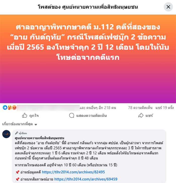 พร้อมทั้งโพสต์ข้อความในคอมเมนต์ ระบุว่า "คดีที่สองของ "อาย กันต์ฤทัย" นี้มี อานนท์ กลิ่นแก้ว จากกลุ่ม ศปปส. เป็นผู้กล่าวหา จากการโพสต์เฟซบุ๊ก 2 ข้อความ เมื่อปี 2565 ศาลอาญาพิพากษาลงโทษจำคุกกระทงละ 3 ปี ให้การรับสารภาพ ลดเหลือจำคุกกระทงละ 1 ปี 6 เดือน รวมจำคุก 2 ปี 12 เดือน พร้อมสั่งให้นับโทษต่อจากคดีแรกก่อนหน้านี้ ซึ่งถูกศาลชั้นต้นลงโทษจำคุก 8 ปี 48 เดือน หากรวมโทษสองคดี อยู่ที่จำคุก 10 ปี 60 เดือน (หรือประมาณ 15 ปี)"