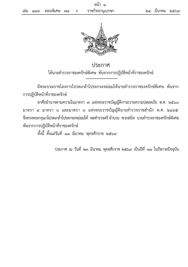 มีพระบรมราชโองการโปรดเกล้าโปรดกระหม่อมให้นายตำรวจราชองครักษ์พิเศษ พ้นจากการปฏิบัติหน้าที่ราชองครักษ์ อาศัยอำนาจตามความในมาตรา 7 แห่งพระราชบัญญัติการถวายความปลอดภัย พ.ศ. 2560 มาตรา 4 มาตรา 6 และมาตรา 9 แห่งพระราชบัญญัตินายตำรวจราชสำนัก พ.ศ. 2495