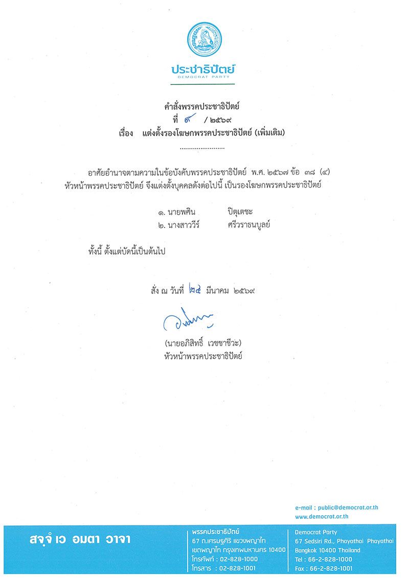 วันที่ 25 มนาคม 2569 พรรคประชาธิปัตย์ ได้แต่งตั้งรองโฆษกพรรคเพิ่มเติมเพื่อเข้ามาเสริมทัพทีมสื่อสารให้เข้มแข็งและครอบคลุมทุกมิติมากยิ่งขึ้น ซึ่งการแต่งตั้งรองโฆษกเพิ่มเติมในครั้งนี้ เป็นการดึงศักยภาพของคนรุ่นใหม่ที่คลุกคลีกับพื้นที่และมีความเข้าใจในบริบทสังคมที่หลากหลาย โดยผู้ที่ได้รับการแต่งตั้งในครั้งนี้ประกอบด้วย นายพศิน ปิตุเตชะ สส. จังหวัดระยอง เขต 3 และ นางสาววีร์ ศรีวราธนบูลย์