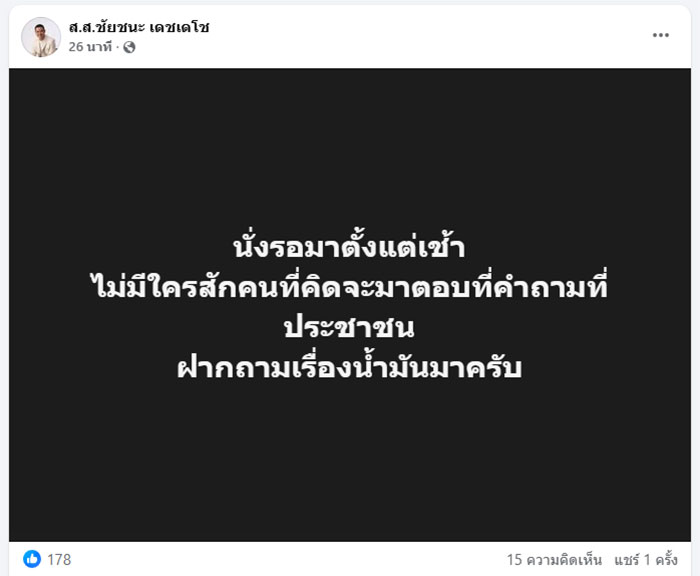 ขณะที่ นายชัยชนะ เดชเดโช สส.บัญชีรายชื่อ และรองหัวหน้าพรรคประชาธิปัตย์ โพสต์ข้อความผ่านเฟซบุ๊ก ระบุว่า "นั่งรอมาตั้งแต่เช้า ไม่มีใครสักคนที่คิดจะมาตอบที่คำถามที่ประชาชน ฝากถามเรื่องน้ำมันมาครับ"