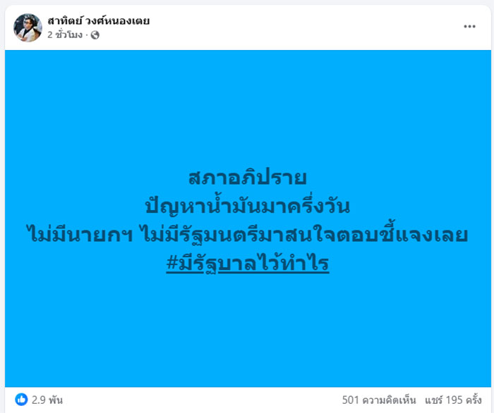 25 มีนาคม 2569 นายสาทิตย์ วงศ์หนองเตย สส.บัญชีรายชื่อ พรรคประชาธิปัตย์ (ปชป.) โพสต์ข้อความผ่านเฟซบุ๊ก ระบุว่า "สภาอภิปรายปัญหาน้ำมันมาครึ่งวัน ไม่มีนายกฯ ไม่มีรัฐมนตรีมาสนใจตอบชี้แจงเลย #มีรัฐบาลไว้ทำไร"