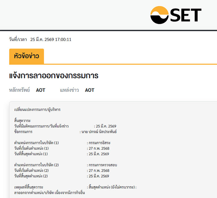 เมื่อวันที่ 25 มีนาคม 2569 เว็บไซต์ตลาดหลักทรัพย์แห่งประเทศไทย ได้เผยแพร่ข่าวแจ้งการลาออกของ นายปกรณ์ นิลประพันธ์ จากตำแหน่ง กรรมการอิสระ และกรรมการตรวจสอบ บริษัท ท่าอากาศยานไทย จำกัด (มหาชน) หรือ AOT โดยให้เหตุผลว่า มีภารกิจอื่น