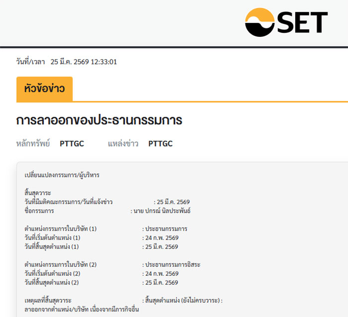 วันนี้เดียวกันก็ได้เผยแพร่ข่าวแจ้งการลาออกของนายปกรณ์ จากตำแหน่ง ประธานกรรมการบริษัท พีทีที โกลบอล เคมิคอล จำกัด (มหาชน) หรือ PTTGC