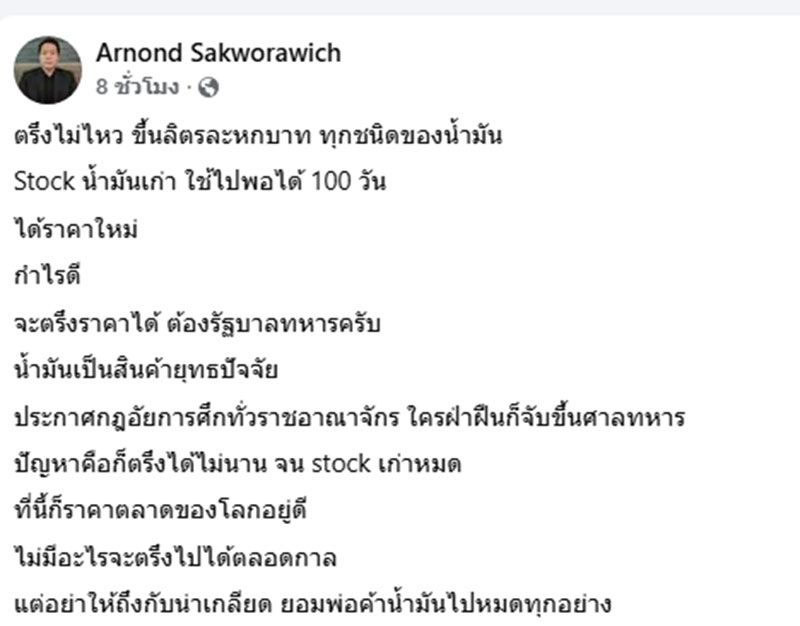 Stock น้ำมันเก่า ใช้ไปพอได้ 100 วัน ได้ราคาใหม่ กำไรดี จะตรึงราคาได้ ต้องรัฐบาลทหารครับ น้ำมันเป็นสินค้ายุทธปัจจัย ปรรัฐบาละกาศกฎอัยการศึกทั่วราชอาณาจักร ใครฝ่าฝืนก็จับขึ้นศาลทหาร