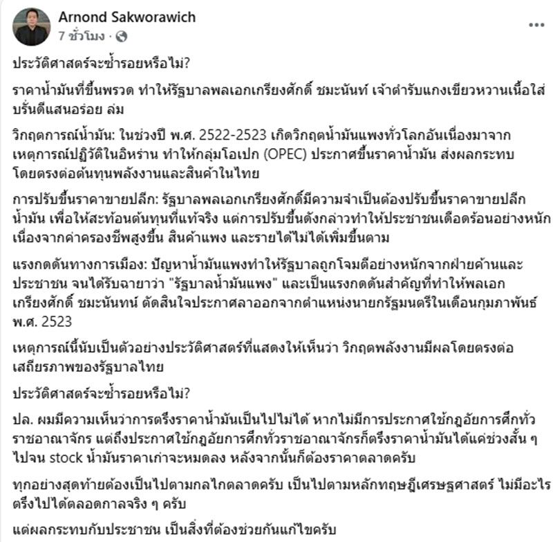 วันที่ 26 มีนาคม 2569 ผศ.ดร.อานนท์ ศักดิ์วรวิชญ์ อาจารย์ประจำคณะสถิติประยุกต์ สถาบันบัณฑิตพัฒนบริหารศาสตร์ (นิด้า) โพสต์ข้อความผ่านเฟซบุ๊กว่า ตรึงไม่ไหว ขึ้นลิตรละหกบาท ทุกชนิดของน้ำมัน
