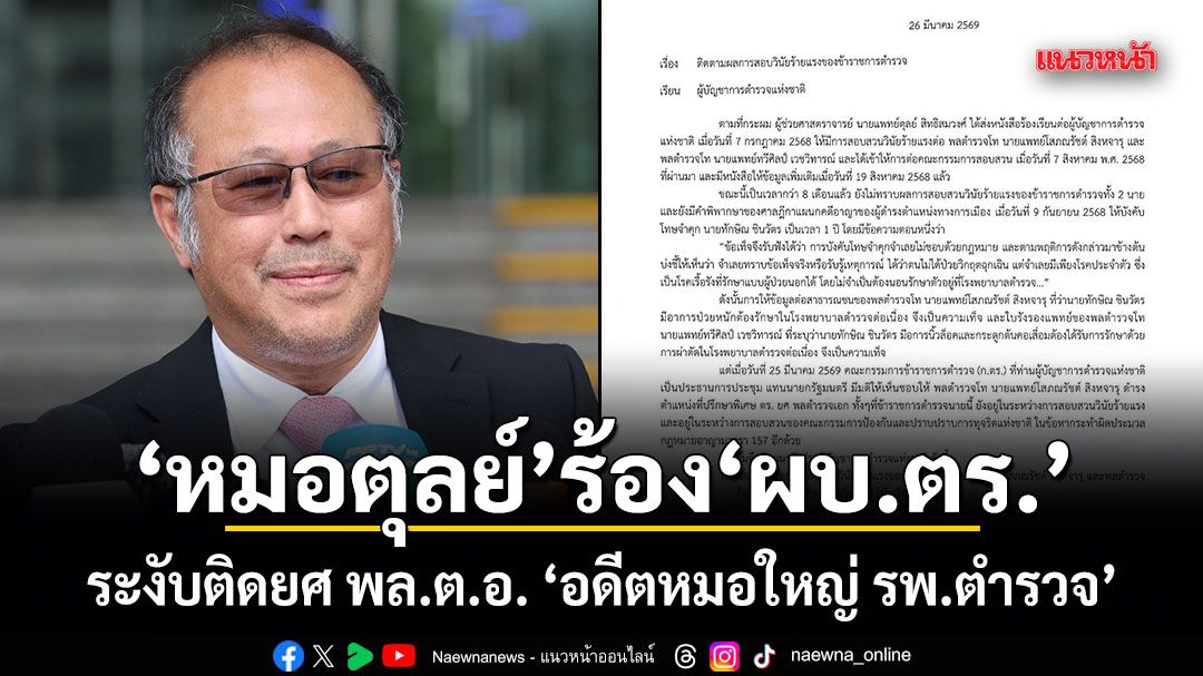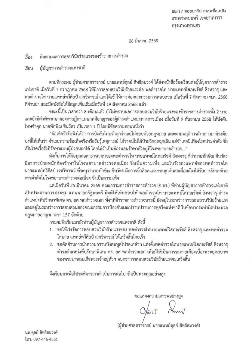26 มีนาคม 2569 นพ.ตุลย์ สิทธิสมวงศ์ นักเคลื่อนไหวทางการเมือง อาจารย์คณะแพทยศาสตร์ จุฬาลงกรณ์มหาวิทยาลัย ได้มีเอกสารหนังสือ เรื่อง ติดตามผลการสอบวินัยร้ายแรงของข้าราชการตำรวจ เรียน ผู้บัญชาการตำรวจแห่งชาติ