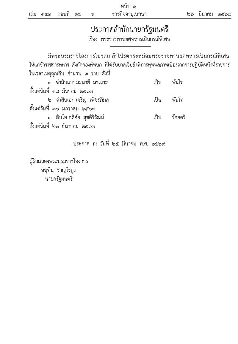 วันที่ 27 มีนาคม 2569 เว็บไซต์ราชกิจจานุเบกษา เผยแพร่ประกาศสำนักนายกรัฐมนตรี เรื่อง พระราชทานยศทหารเป็นกรณีพิเศษ ความว่ามีพระบรมราชโองการโปรดเกล้าโปรดกระหม่อมพระราชทานยศทหารเป็นกรณีพิเศษให้แก่ข้าราชการทหาร สังกัดกองทัพบก ที่ได้รับบาดเจ็บถึงพิการทุพพลภาพเนื่องจากการปฏิบัติหน้าที่ราชการในเวลาเหตุฉุกเฉิน จำนวน 3 ราย ดังนี้