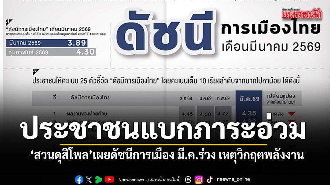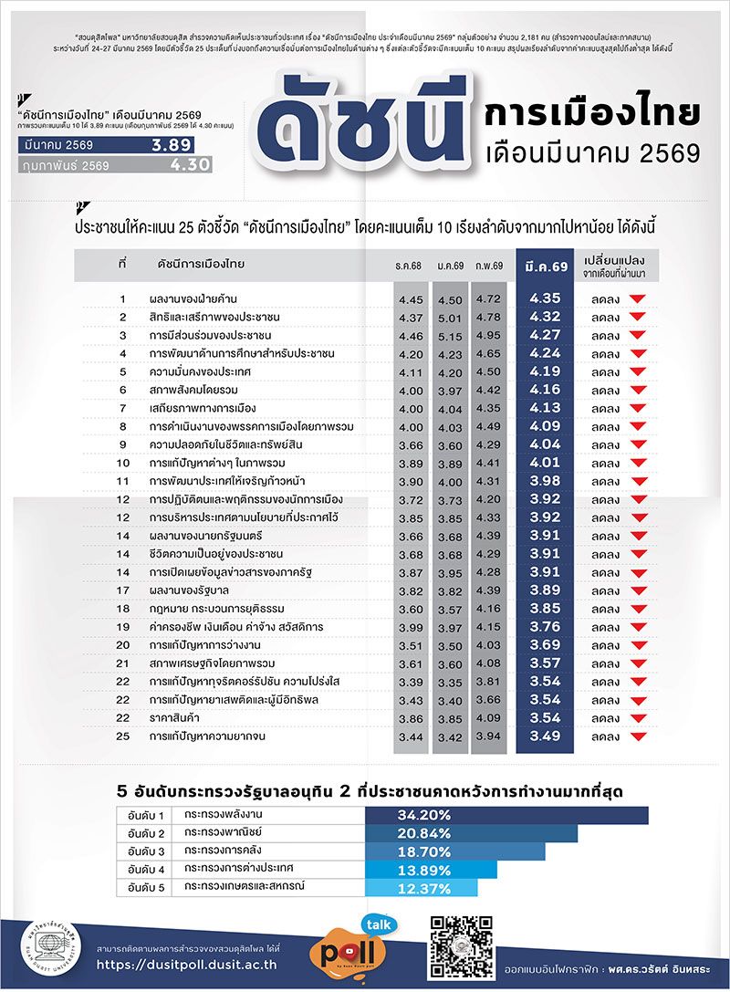 29 มีนาคม 2569 สวนดุสิตโพล มหาวิทยาลัยสวนดุสิต สำรวจความคิดเห็นประชาชนทั่วประเทศ เรื่อง “ดัชนีการเมืองไทยประจำเดือนมีนาคม 2569” กลุ่มตัวอย่าง จำนวน 2,181 คน (สำรวจทางออนไลน์และภาคสนาม) ระหว่างวันที่ 24-27 มีนาคม 2569 พบว่า กลุ่มตัวอย่างให้คะแนนภาพรวมดัชนีการเมืองไทยประจำเดือนมีนาคม เฉลี่ย 3.89 คะแนนลดลงจากเดือนกุมภาพันธ์ 2569 ที่ได้ 4.30 คะแนน ตัวชี้วัดที่ได้คะแนนสูงสุด คือ ผลงานของฝ่ายค้าน ได้คะแนนเฉลี่ย 4.35คะแนน ตัวชี้วัดที่ได้คะแนนต่ำสุด คือการแก้ปัญหาความยากจน ได้คะแนนเฉลี่ย 3.49 คะแนนทั้งนี้กระทรวงที่ประชาชนคาดหวังการทำงานมากที่สุด คือ กระทรวงพลังงาน ร้อยละ 34.20 รองลงมาคือ กระทรวงพาณิชย์ร้อยละ 20.84