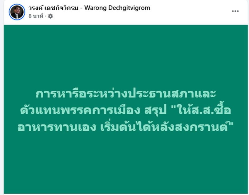 อย่างไรก็ดีหลังการประชุมประมาณ 1 ชั่วโมง นพ.วรงค์ ได้โพสต์ข้อความผ่านเฟซบุ๊คว่า "การหารือระหว่างประธานสภาและตัวแทนพรรคการเมือง สรุปให้สส.ซื้ออาหารทานเอง เริ่มต้นได้หลังสงกรานต์”