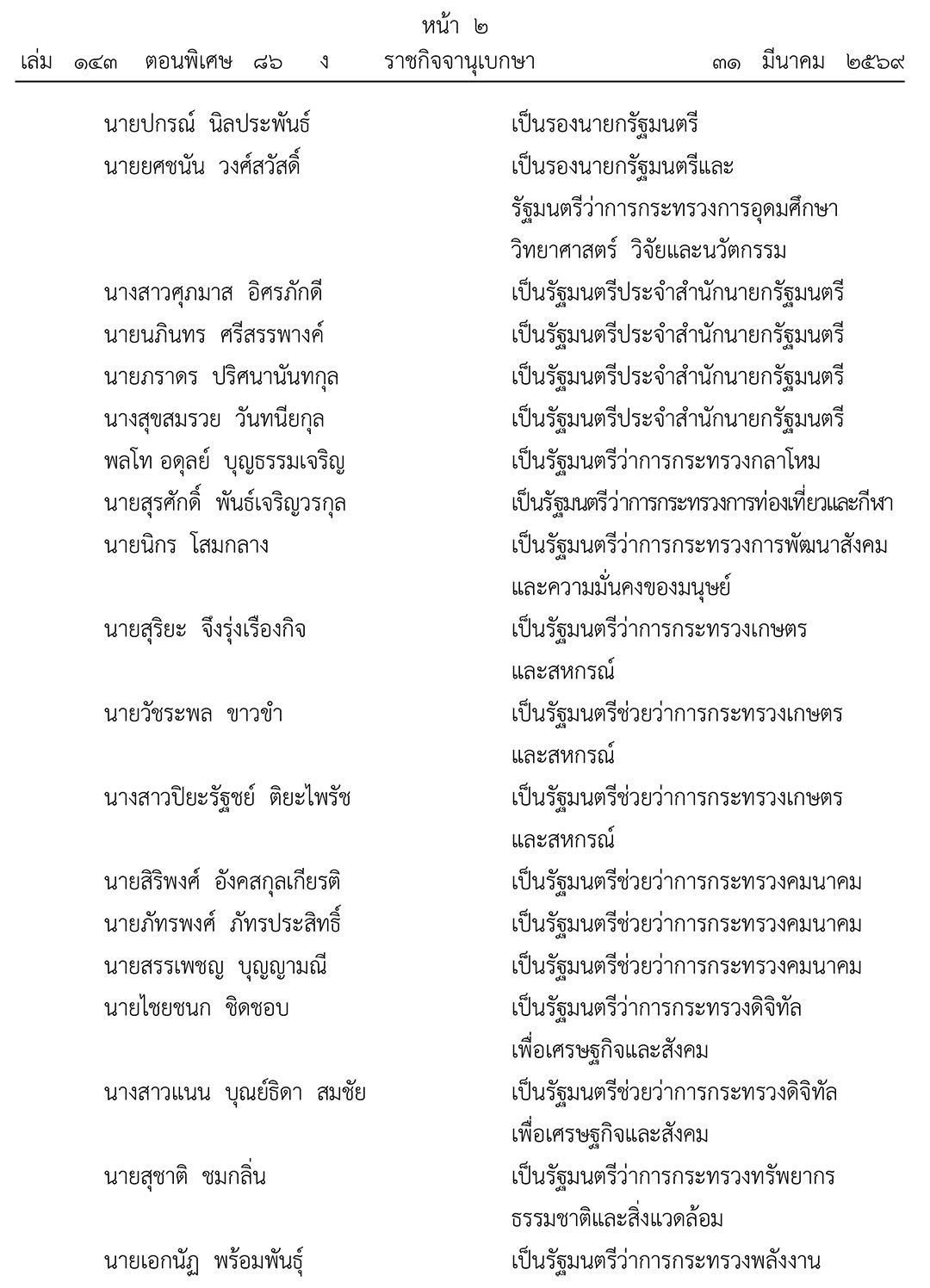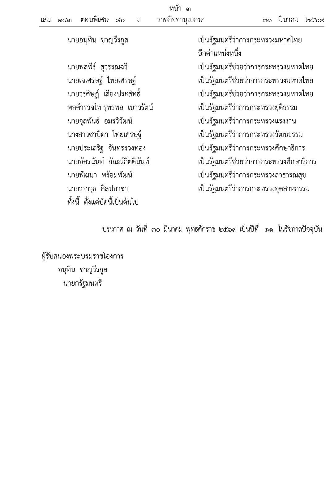 31 มีนาคม 2569 เว็บไซต์ราชกิจจานุเบกษา ประกาศแต่งตั้งรัฐมนตรี ความว่า พระบาทสมเด็จพระปรเมนทรรามาธิบดีศรีสินทรมหาวชิราลงกรณ พระวชิรเกล้าเจ้าอยู่หัว มีพระบรมราชโองการโปรดเกล้าฯ ให้ประกาศว่า ตามที่ได้ทรงพระกรุณาโปรดเกล้าโปรดกระหม่อมแต่งตั้ง นายอนุทิน ชาญวีรกูล เป็นนายกรัฐมนตรี ตามประกาศลงวันที่ 19 มีนาคม พุทธศักราช 2569 แล้วนั้น