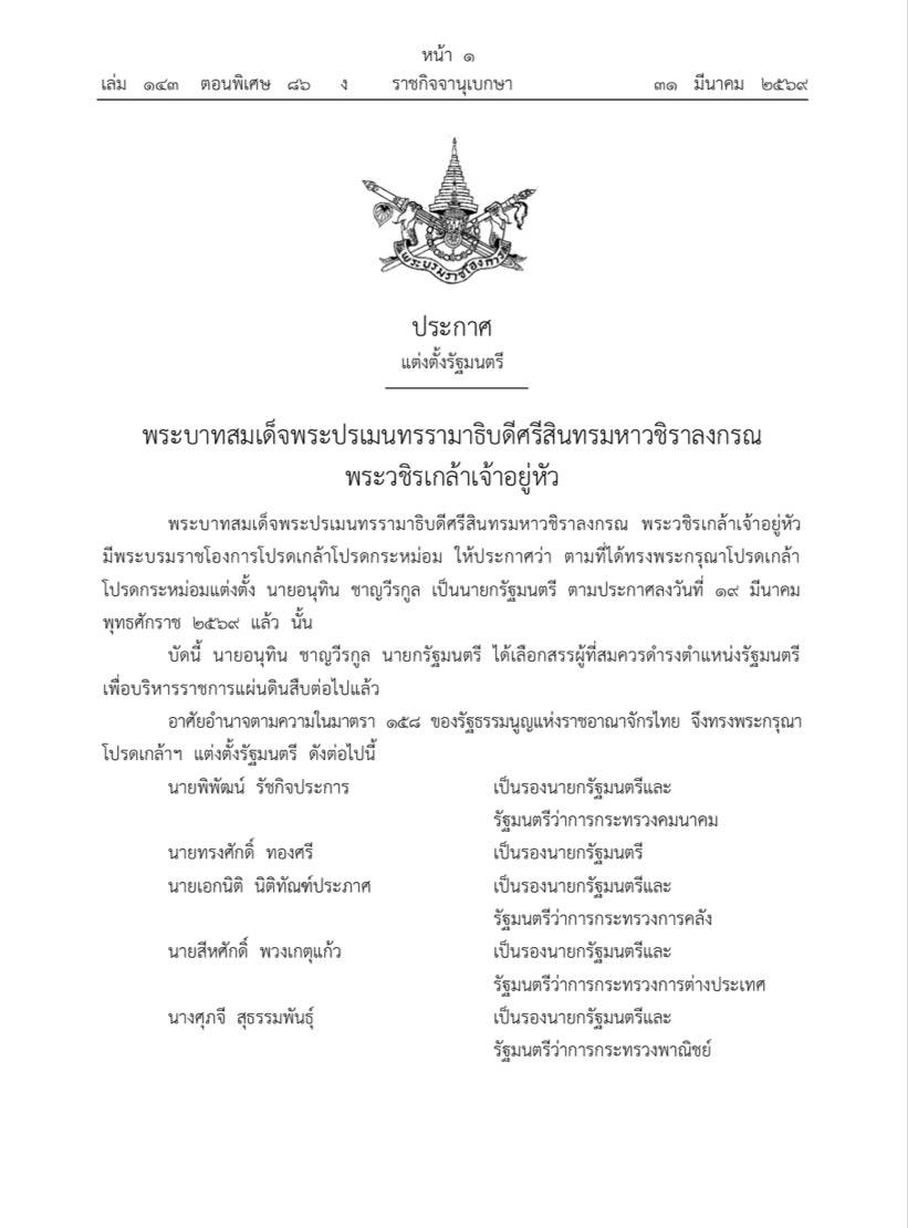 เมื่อวันที่ 31 มีนาคม 2569 ผู้สื่อข่าวรายงานว่า ราชกิจจานุเบกษา ประกาศ แต่งตั้งรัฐมนตรี ความว่าพระบาทสมเด็จพระปรเมนทรรามาธิบดีศรีสินทรมหาวชิราลงกรณพระวชิรเกล้าเจ้าอยู่หัว มีพระบรมราชโองการโปรดเกล้าโปรดกระหม่อม ให้ประกาศว่า ตามที่ได้ทรงพระกรุณาโปรดเกล้าโปรดกระหม่อมแต่งตั้ง นายอนุทิน ชาญวีรกูล เป็นนายกรัฐมนตรี ตามประกาศลงวันที่ 19 มีนาคมพุทธศักราช 2569 แล้ว นั้น