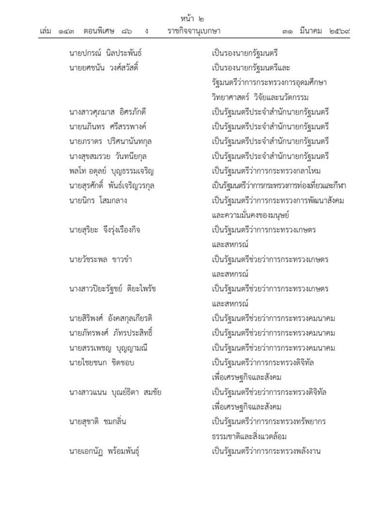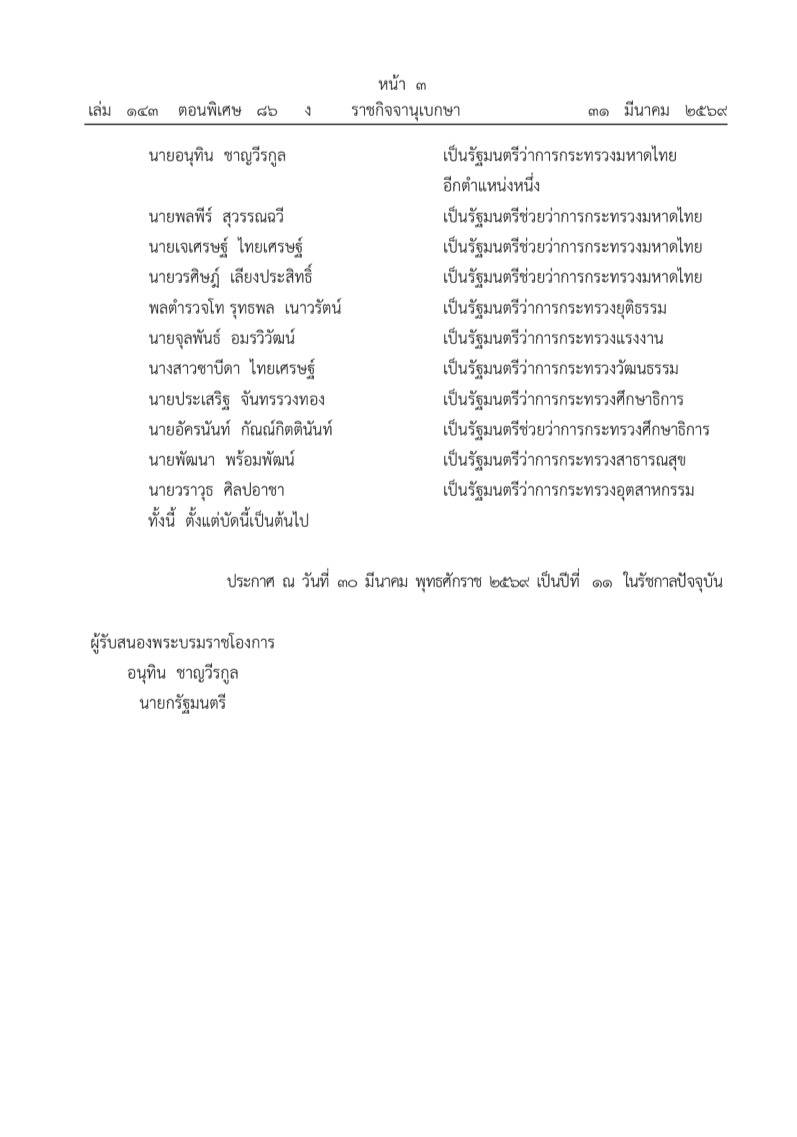 ทั้งนี้ ตั้งแต่บัดนี้เป็นต้นไป ประกาศ ณ วันที่ 30 มีนาคม พุทธศักราช 2569 เป็นปีที่ 11 ในรัชกาสปัจจุบัน ผู้รับสนองพระบรมราชโองการ นายอนุทีน ชาญวีรกูล นายกรัฐมนตรี