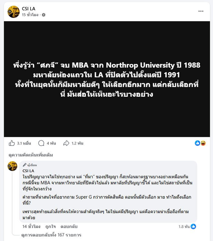 1 เมษายน 2569 ที่ทำเนียบรัฐบาล นางศุภจี สุธรรมพันธุ์ รัฐมนตรีว่าการกระทรวงพาณิชย์ กล่าวถึงกรณีเพจ CSI LA ออกมาเปิดข้อมูลว่า มหาวิทยาลัยที่นางศุภจี เรียนจบ เป็นมหาวิทยาลัยห้องแถวใน LA ที่ปิดตัวไปตั้งแต่ปี 1991 ว่า ไม่ใช่หรอก คนที่จบจากมหาวิทยาลัยแบบนี้มีมากมาย ในประเทศไทยก็มี และผลิตบุคลากรจำนวนมาก ยืนยันว่าเรียนจริงๆ จบจริงๆ ส่วนเรียนจบมาแล้วมหาวิทยาลัยเขาปิดหรือไม่ปิดไม่ใช่เรื่องของเรา แต่ช่วงที่เรียนก็มีอยู่จริง และเราก็ทำงานมาขนาดนี้ในบริษัทต่างๆ และมีผลงานมากมาย ไม่ได้คิดว่าเป็นประเด็นอะไร ก่อนที่ยกมือปัด พร้อมกับส่ายหน้าและกล่าวว่า "ไร้สาระมาก"