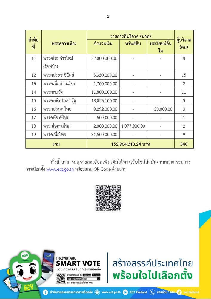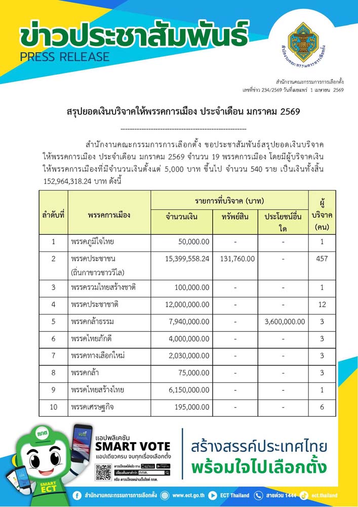 วันที่ 1 เมษายน 2569 สำนักงานคณะกรรมการการเลือกตั้ง สรุปยอดเงินบริจาคให้พรรคการเมือง ประจำเดือน มกราคม 2569 จำนวน 19 พรรคการเมือง โดยมีผู้บริจาคเงินให้พรรคการเมืองที่มีจำนวนเงินตั้งแต่ 5,000 บาท ขึ้นไป จำนวน 540 ราย เป็นเงินทั้งสิ้น 152,964,318.24 บาท