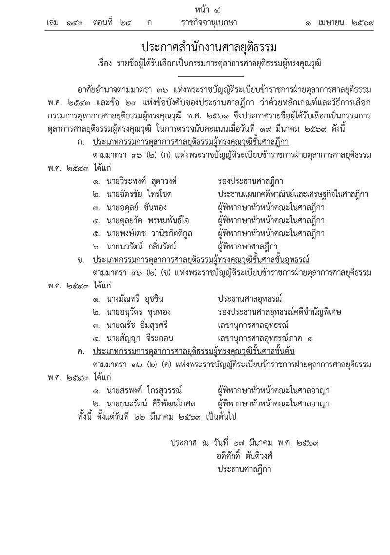 วันที่ 1 เมษายน 2569 เว็บไซต์ราชกิจจานุเบกษาเผยแพร่ประกาศสำนักงานศาลยุติธรรม เรื่อง รายชื่อผู้ได้รับเลือกเป็นกรรมการตุลาการศาลยุติธรรมผู้ทรงคุณวุฒิ จำนวน 12 ราย ดังนี้