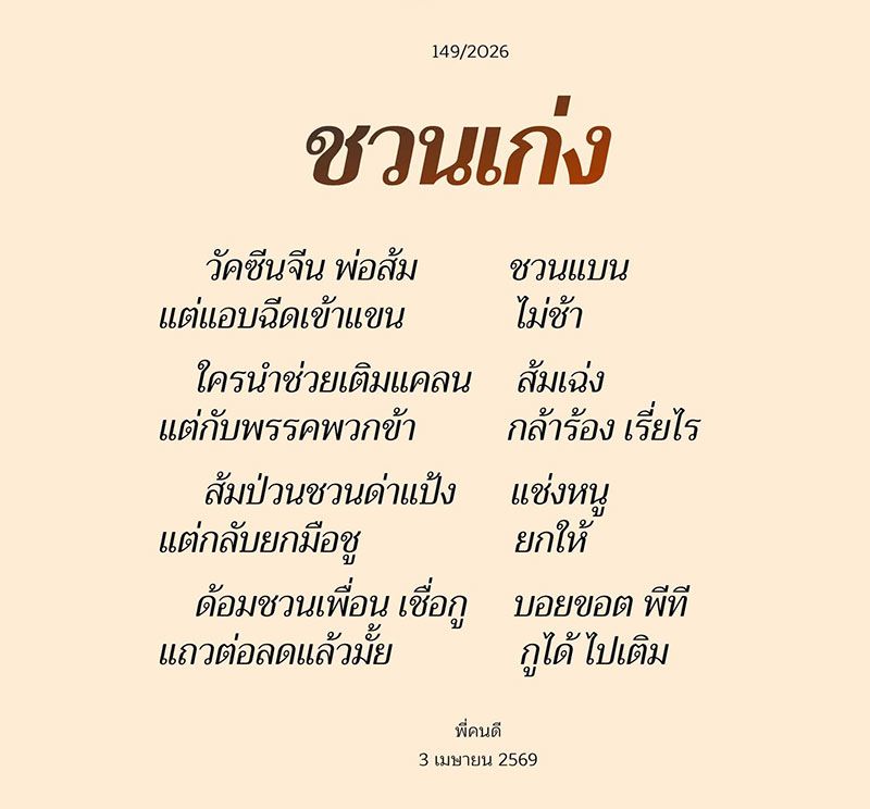 วันที่ 19 มีนาคม 2569 เฟซบุ๊กเพจ 'P.khondee(พี่คนดี กวีสมัครเล่น)' ที่มีผู้ติดตามบนมากกว่า 1.4 แสนราย ได้ออกมาโพสต์บทกลอนว่า 49/2026 ชวนเก่ง