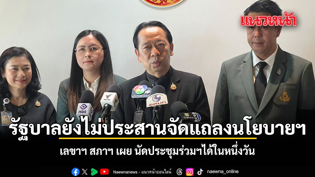 วันนี้ 3 เมษายน 2569 ที่รัฐสภา นายศิโรจน์ แพทย์พันธุ์ เลขาธิการสภาผู้แทนราษฎร เปิดเผยว่า ยังไม่ได้รับการประสานจากสำนักงานเลขาธิการคณะรัฐมนตรี เรื่องการประชุมร่วมรัฐสภา เพื่อแถลงนโยบายของรัฐบาล ต้องรอให้ คณะรัฐมนตรี(ครม.) ชุดใหม่เข้าเฝ้าทูลละอองธุลีพระบาทถวายสัตย์ปฏิญาณก่อน จากนั้นนายกรัฐมนตรี จะทำหนังสือถึงประธานรัฐสภาเพื่อแจ้งให้ทราบว่าจะขอแถลงนโยบายต่อรัฐสภา และจะมีการปรึกษาหารือถึงการกำหนดวันที่เหมาะสม ยืนยันว่าไม่ว่าจะเป็นวันไหน สำนักงานเลขาฯสภาฯก็พร้อมดำเนินการจัดการประชุม และการแถลงนโยบายถือเป็นเรื่องเร่งด่วน สามารถนัดวันประชุมได้ทันทีภายในหนึ่งวัน โดยไม่นับรวมวันที่รับและส่งเอกสาร