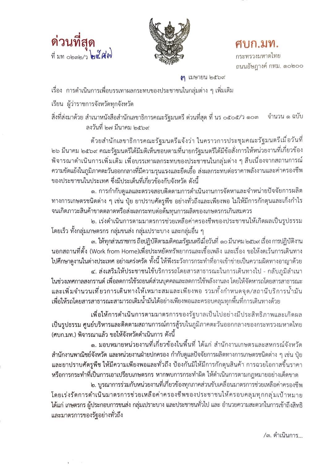 3เม.ย.2569 นายอรรษิษฐ์ สัมพันธรัตน์ ปลัดกระทรวงมหาดไทย ในฐานะผู้อำนวยการศูนย์บริหารและติดตามสถานการณ์การสู้รบในภูมิภาคตะวันออกกลางของกระทรวงมหาดไทย (ศบก.มท.) เปิดเผยว่า กระทรวงมหาดไทยได้ขานรับนโยบายเร่งด่วนของรัฐบาลตามมติคณะรัฐมนตรี เมื่อวันที่ 26 มีนาคม 2569 ซึ่งนายอนุทิน ชาญวีรกูล นายกรัฐมนตรีและรัฐมนตรีว่าการกระทรวงมหาดไทย ได้สั่งการให้เร่งยกระดับมาตรการช่วยเหลือพี่น้องประชาชนจากผลกระทบของสถานการณ์ความขัดแย้งในภูมิภาคตะวันออกกลางที่ยังคงยืดเยื้อ ซึ่งส่งผลกระทบโดยตรงต่อเสถียรภาพราคาพลังงานและภาระค่าครองชีพของพี่น้องประชาชนในวงกว้าง