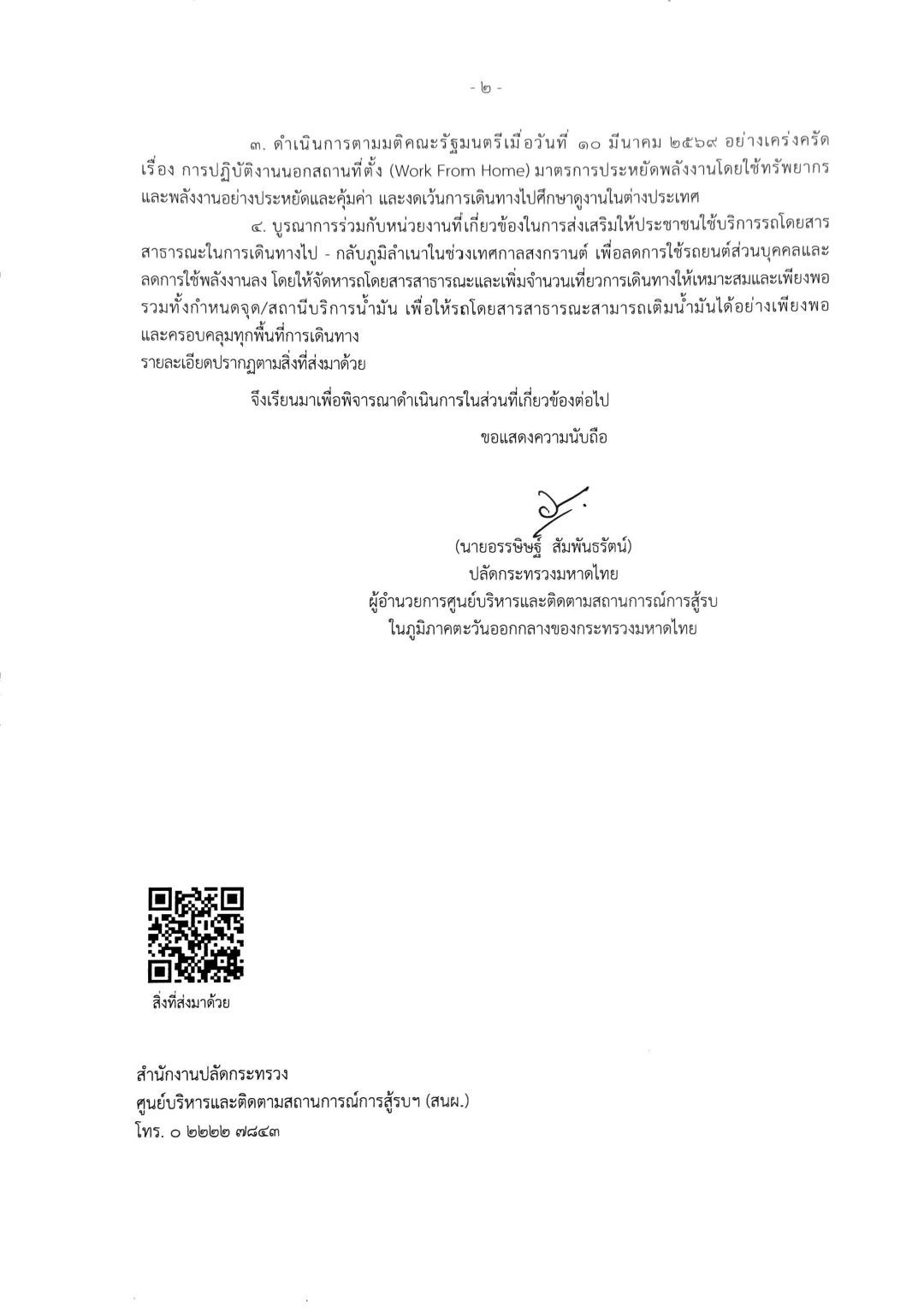 นายอรรษิษฐ์ กล่าวอีกว่า 3. ดำเนินมาตรการที่เกี่ยวข้องกับการปฏิบัติราชการอย่างเคร่งครัด ทั้งการปฏิบัติงานนอกสถานที่ตั้ง (Work From Home) มาตรการประหยัดพลังงานโดยใช้ทรัพยากร และพลังงานอย่างประหยัดและคุ้มค่า และงดเว้นการเดินทางไปศึกษาดูงานในต่างประเทศ และ 4. บูรณาการร่วมกับหน่วยงานที่เกี่ยวข้องส่งเสริมให้ประชาชนใช้บริการสาธารณะในการเดินทางไป - กลับภูมิลำเนาในช่วงเทศกาลสงกรานต์ โดยจัดหารถโดยสารสาธารณะและเพิ่มจำนวนเที่ยวการเดินทางให้เหมาะสมและเพียงพอ และกำหนดจุด/สถานีบริการน้ำมัน เพื่อให้รถโดยสารสาธารณะสามารถเติมน้ำมันได้อย่างเพียงพอครอบคลุมทุกพื้นที่การเดินทาง เพื่อลดการใช้รถยนต์ส่วนบุคคลและลดการใช้พลังงาน