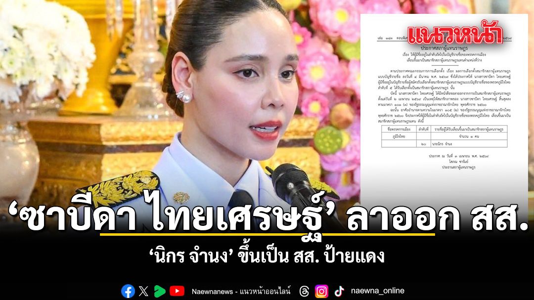 บัดนี้ นางสาวซาบีดา ไทยเศรษฐ์ ได้มีหนังสือขอลาออกจากการเป็นสมาชิกสภาผู้แทนราษฎร ตั้งแต่วันที่ 2 เมษายน 2569 เป็นเหตุให้สมาชิกภาพของ นางสาวซาบีดา ไทยเศรษฐ์ สิ้นสุดลง ตามมาตรา 101 (3) ของรัฐธรรมนูญแห่งราชอาณาจักรไทย พุทธศักราช 2560