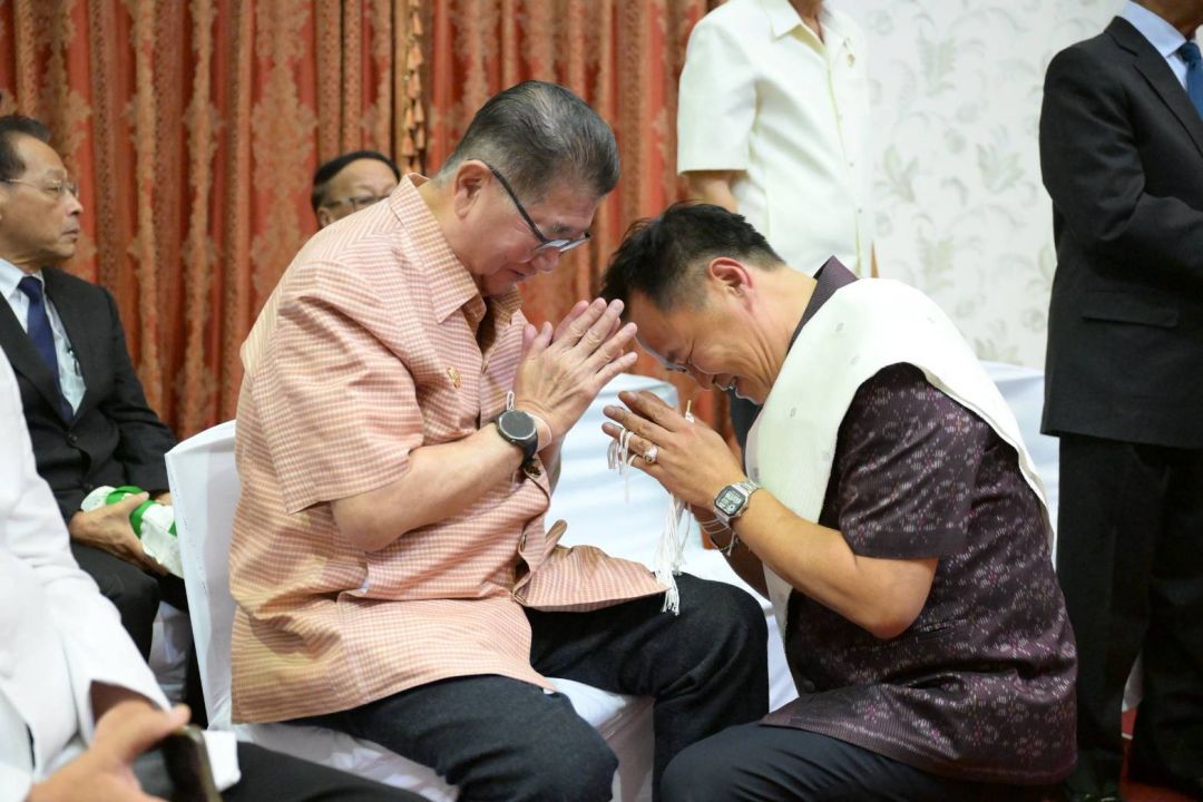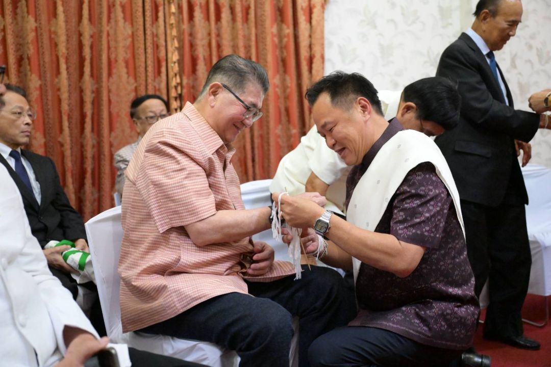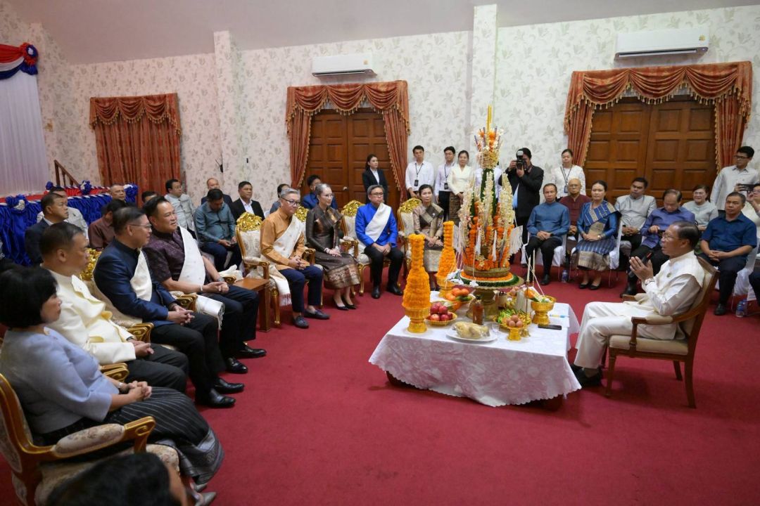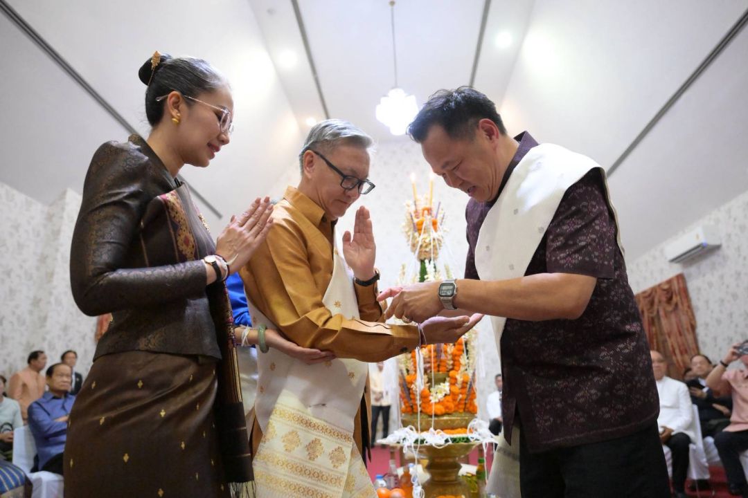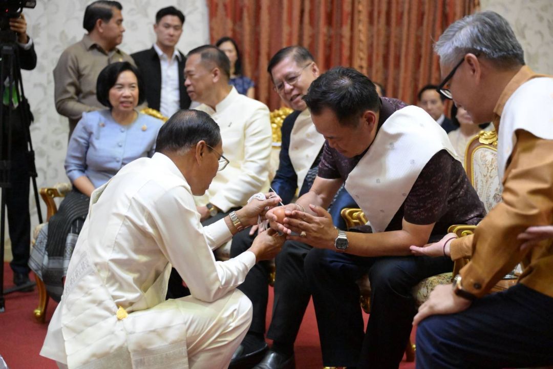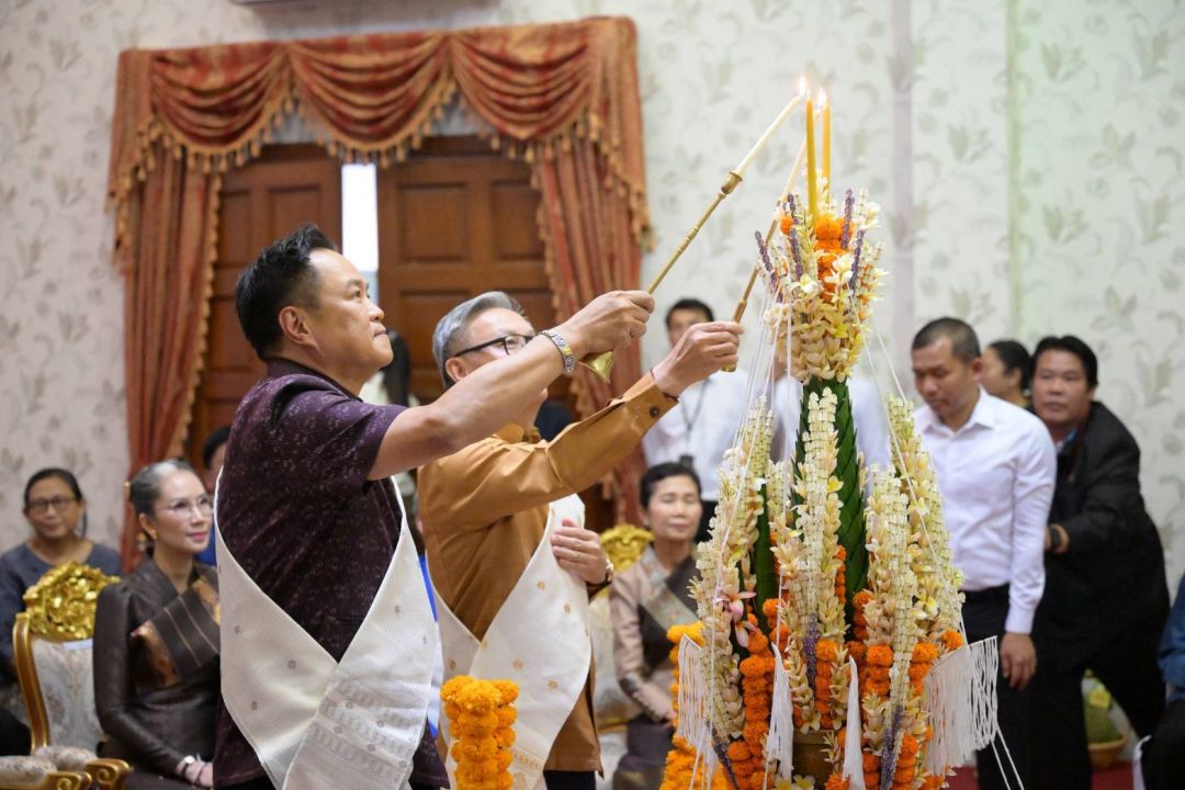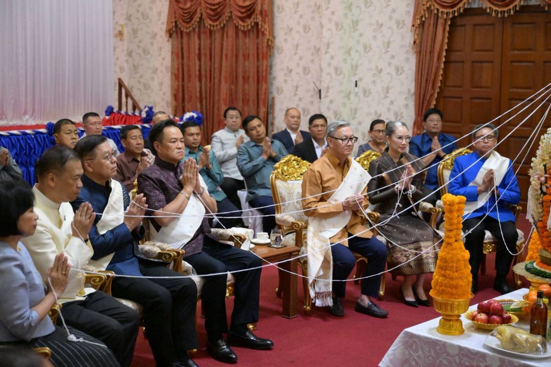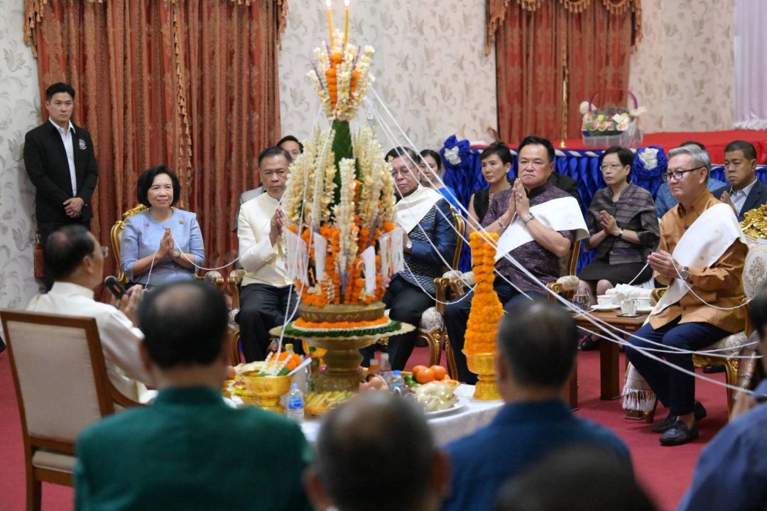 โอกาสนี้ นายกรัฐมนตรีได้มอบแจกันดอกไม้แสดงความยินดีแก่เอกอัครราชทูต สปป.ลาว ก่อนเข้าร่วมพิธีบายศรีสู่ขวัญ ณ ห้องโถงสโมสร ซึ่งเป็นพิธีสำคัญตามขนบธรรมเนียมลาว โดยมีพิธีสวดเรียกขวัญ การเจิมและทำน้ำมนต์ และผูกสายสิญจน์เพื่อความเป็นสิริมงคล