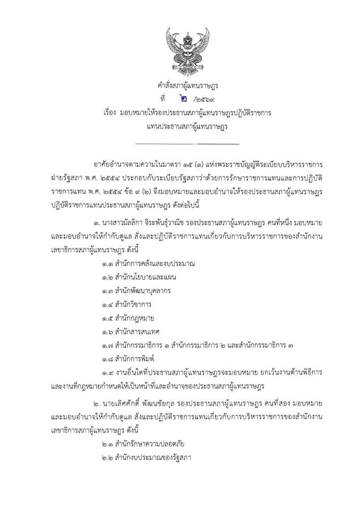 นอกจากนั้น มอบหมายและมอบอำนาจให้สั่งและปฏิบัติราชการแทนเกี่ยวกับการบริหารราชการของสำนักงานเลขาธิการสภาผู้แทนราษฎร ดังนี้ สำนักรักษาความปลอดภัย และสำนักงบประมาณของรัฐสภา