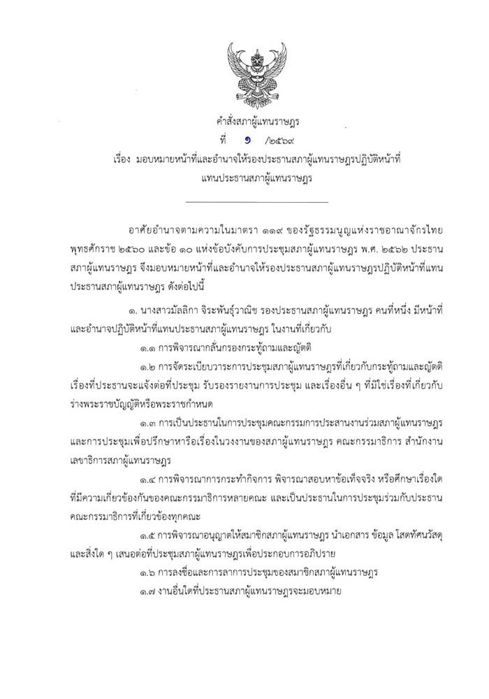6 เมษายน 2569 ผู้สื่อข่าวรายงานว่า นายโสภณ ซารัมย์ ประธานสภาผู้แทนราษฎร ได้ลงนามคำสั่งประธานสภาฯ มอบหมายหน้าที่และอำนาจให้รองประธานสภาผู้แทนราษฎรปฏิบัติหน้าที่แทนประธานสภาผู้แทนราษฎร ลงวันที่ 31 มีนาคม โดยมอบหมาย น.ส.มัลลิกา จิระพันธุ์วาณิช รองประธานสภาผู้แทนราษฎร คนที่หนึ่ง มีหน้าที่และอำนาจในงานที่เกี่ยวกับการพิจารณากลั่นกรองกระทู้ถามและญัตติ, การจัดระเบียบวาระการประชุมสภาผู้แทนราษฎรที่เกี่ยวกับกระทู้ถามและญัตติ, เรื่องที่ประธานจะแจ้งต่อที่ประชุม รับรองรายงานการประชุม และเรื่องอื่นๆ ที่มิใช่เรื่องที่เกี่ยวกับร่างพระราชบัญญัติหรือพระราชกำหนด, การเป็นประธานในการประชุมคณะกรรมการประสานงานร่วมสภาผู้แทนราษฎร และการประชุมเพื่อปรึกษาหารือเรื่องในวงงานของสภาฯ คณะกรรมาธิการ สำนักงานเลขาธิการสภาผู้แทนราษฎร, การพิจารณาการกระทำกิจการ พิจารณาสอบหาข้อเท็จจริง หรือศึกษาเรืองใดที่มีความเกี่ยวข้องกันของคณะกรรมาธิการหลายคณะ และเป็นประธานในการประชุมร่วมกับประธานคณะกรรมาธิการที่เกี่ยวข้องทุกคณะ, การพิจารณาอนุญาตให้สมาชิกสภาผู้แทนราษฎร นำเอกสาร ข้อมูล โสตทัศนวัสดุ และสิ่งใดๆ เสนอต่อที่ประชุมสภาผู้แทนราษฎรเพื่อประกอบการอภิปราย รวมทั้งรับผิดชอบเรื่องการลงชื่อ และการลาประชุมของ สส.
