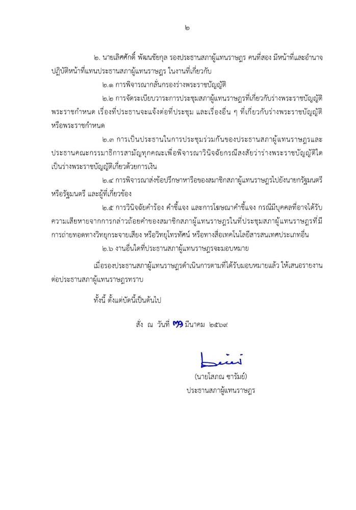 นอกจากนั้น ยังมอบอำนาจให้สั่งและปฏิบัติราชการแทนเกี่ยวกับการบริหารราชการของสำนักงานเลขาธิการสภาผู้แทนราษฎร ดังนี้ สำนักการคลังและงบประมาณ, สำนักนโยบายและแผน, สำนักพัฒนาบุคลากร, สำนักวิชาการ, สำนักกฎหมาย, สำนักสารสนเทศ, สำนักกรรมาธิการ, สำนักการพิมพ์, งานอื่นใดที่ประธานสภาผู้แทนราษฎรจะมอบหมาย ยกเว้นงานด้านพิธีการและงานที่กฎหมายกำหนดให้เป็นหน้าที่และอำนาจของประธานสภาผู้แทนราษฎร