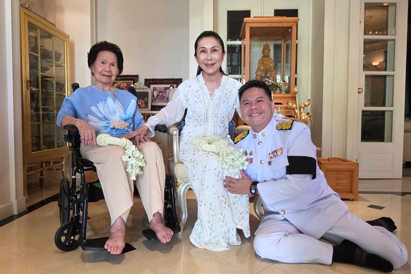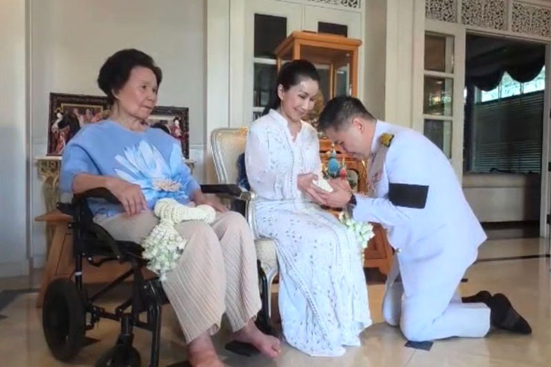 โดยนายวราวุธนำพวงมาลัยกราบคุณหญิงแจ่มใส พร้อมกล่าวว่า “ลูกชายมาขอพรแม่ครับ“ ซึ่งคุณหญิงแจ่มใส ได้กล่าวอวยพรว่า “คิดอะไรขอให้ได้ทุกสิ่งทุกอย่างที่ต้องการ“