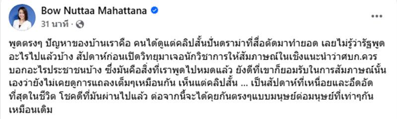 วันที่ 7 เมษายน 2569 โบว์ ณัฏฐา มหัทธนา อดีตโฆษกศูนย์บริหารและติดตามสถานการณ์การสู้รบในภูมิภาคตะวันออกกลาง (ศบก.) โพสต์ข้อความว่าพูดตรงๆ ปัญหาของบ้านเราคือ คนได้ดูแต่คลิปสั้นปั่นดราม่าที่สื่อตัดมาทำยอด เลยไม่รู้ว่ารัฐพูดอะไรไปแล้วบ้าง