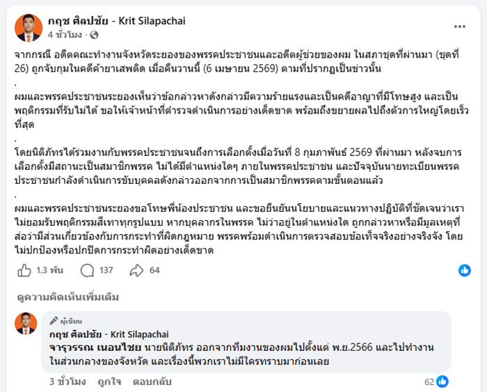 7 เมษายน 2569 นายกฤช ศิลปชัย สส.ระยอง พรรคประชาชน (ปชน.) โพสต์ข้อความผ่านเฟซบุ๊ก ระบุว่า จากกรณี อดีตคณะทำงานจังหวัดระยองของพรรคประชาชนและอดีตผู้ช่วยของผม ในสภาชุดที่ผ่านมา (ชุดที่ 26) ถูกจับกุมในคดีค้ายาเสพติด เมื่อคืนวานนี้ (6 เมษายน 2569) ตามที่ปรากฏเป็นข่าวนั้น