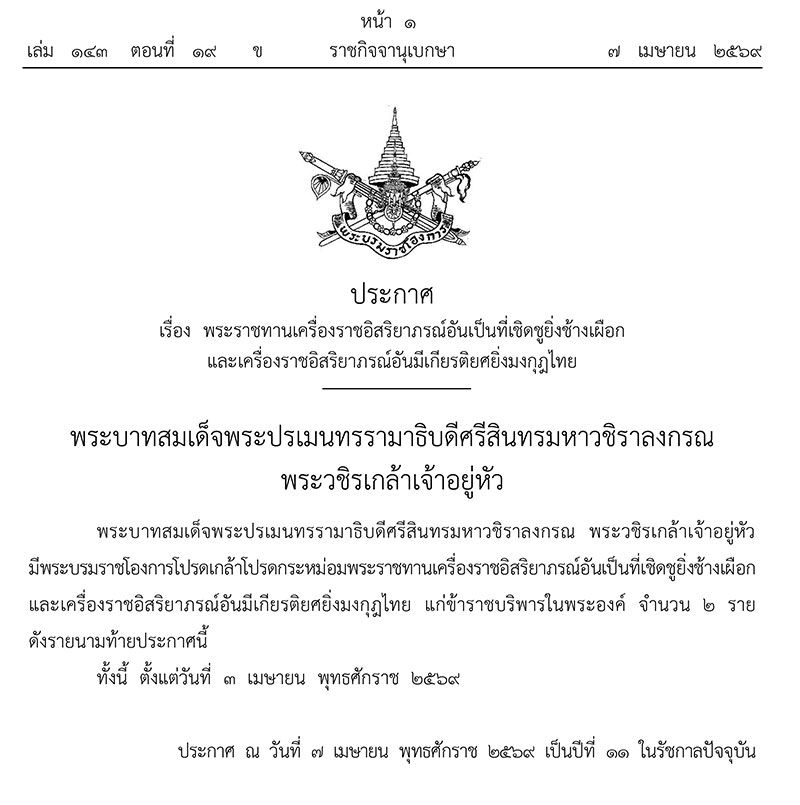วันที่ 8 เมษายน 2569 เว็บไซต์ ราชกิจจานุเบกษา เผยแพร่ พระบรมราชโองการ ประกาศ เรื่อง พระราชทานเครื่องราชอิสริยาภรณ์อันเป็นที่เชิดชูยิ่งช้างเผือก และเครื่องราชอิสริยาภรณ์อันมีเกียรติยศยิ่งมงกุฎไทย