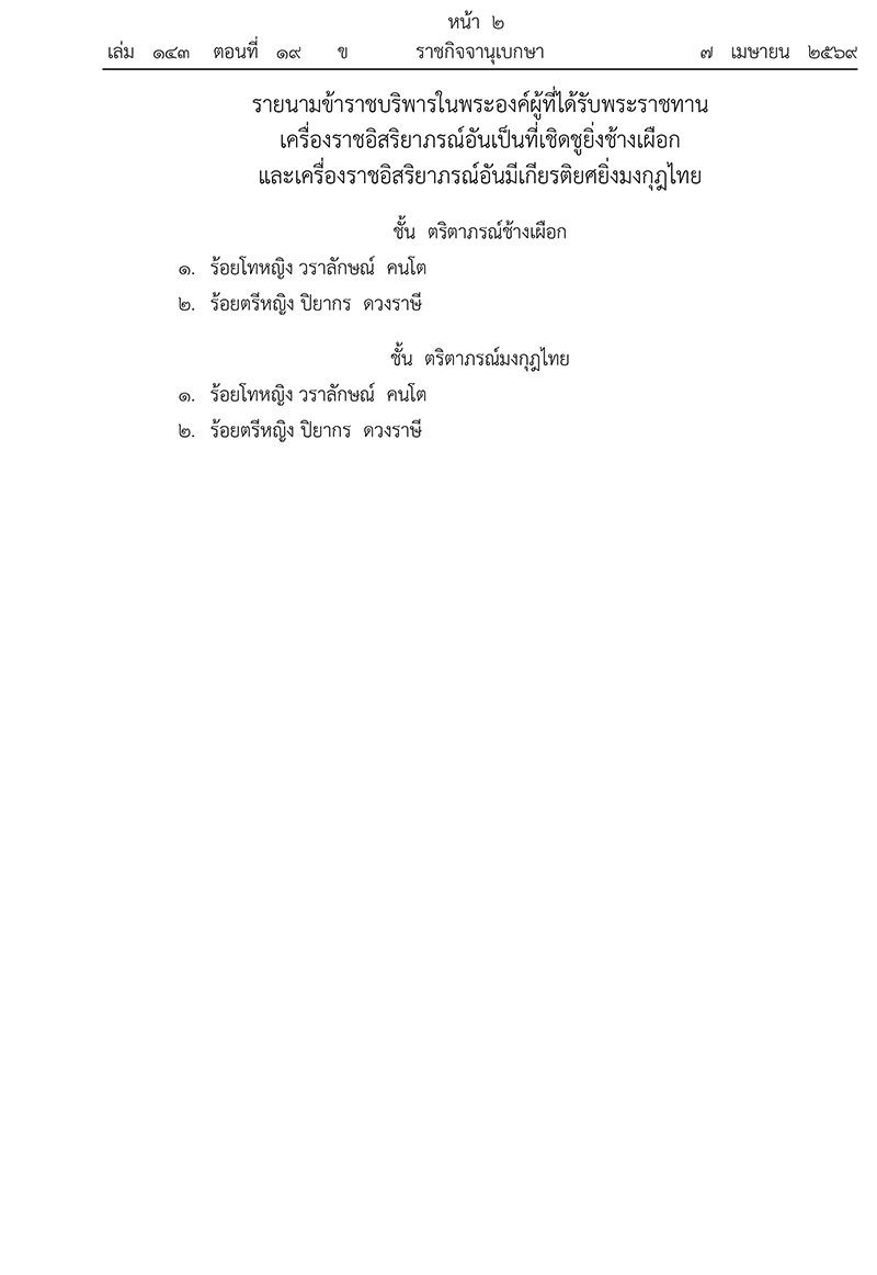 พระบาทสมเด็จพระปรเมนทรรามาธิบดีศรีสินทรมหาวชิราลงกรณ พระวชิรเกล้าเจ้าอยู่หัว มีพระบรมราชโองการโปรดเกล้าโปรดกระหม่อม พระราชทานเครื่องราชอิสริยาภรณ์อันเป็นที่เชิดชูยิ่งช้างเผือก และเครื่องราชอิสริยาภรณ์อันมีเกียรติยศยิ่งมงกุฎไทย แก่ ข้าราชบริพารในพระองค์ จำนวน 2 ราย ดังรายนามท้ายประกาศนี้