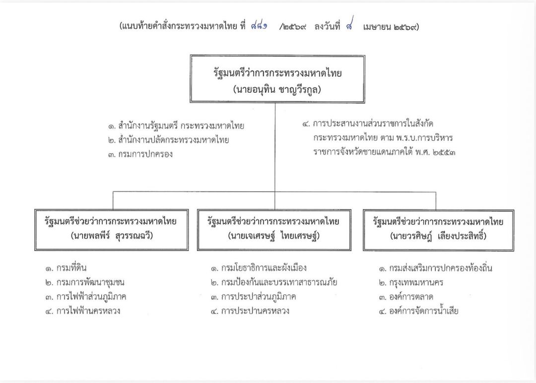 เมื่อวันที่ 8 เม.ย.2569 ผู้สื่อข่าวรายงานว่า นายอนุทิน ชาญวีรกูล นายกรัฐมนตรี ในฐานะรัฐมนตรีว่าการกระทรวงมหาดไทย ได้ลงนามในคำสั่งกระทรวงมหาดไทย ที่881/2569 ลงวันที่ 8เม.ย.69 เรื่องการมอบหมายอำนาจหน้าที่ให้รัฐมนตรีช่วยว่าการกระทรวงมหาดไทย ปฏิบัติราชการแทนรัฐมนตรีว่าการกระทรวงมหาดไทย เพื่อแบ่งมอบภารกิจหน่วยงานในสังกัดกระทรวงมหาดไทย และรมช.มหาดไทย ทั้ง 3 คน ให้กำกับดูแล โดยนายอนุทิน นายกฯ ในฐานะรมว.มหาดไทย(มท.1) กำกับดูแล 1.สำนักงานรัฐมนตรีกระทรวงมหาดไทย 2.สำนักงานปลัดกระทรวงมหาดไทย 3.กรมการปกครอง และ 4.การประสานงานส่วนราชการในสังกัดกระทรวงมหาดไทย ตามพ.ร.บ.การบริการราชการจังหวัดชายแดนภาคใต้ พ.ศ.2553