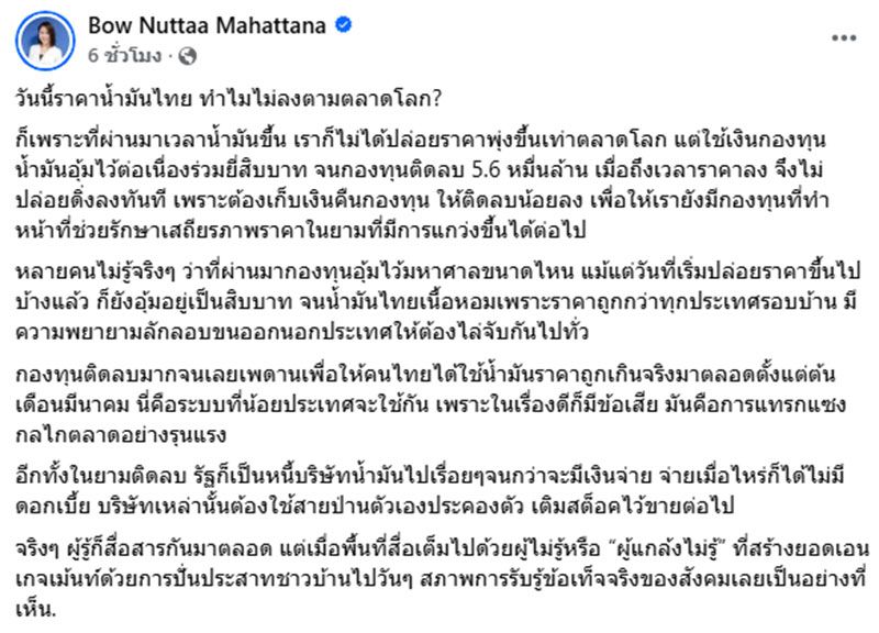 วันที่ 9 เมษายน 2569 โบว์ ณัฏฐา มหัทธนา อดีตโฆษกศูนย์บริหารและติดตามสถานการณ์การสู้รบในภูมิภาคตะวันออกกลาง (ศบก.) โพสต์ข้อความว่า วันนี้ราคาน้ำมันไทย ทำไมไม่ลงตามตลาดโลก?