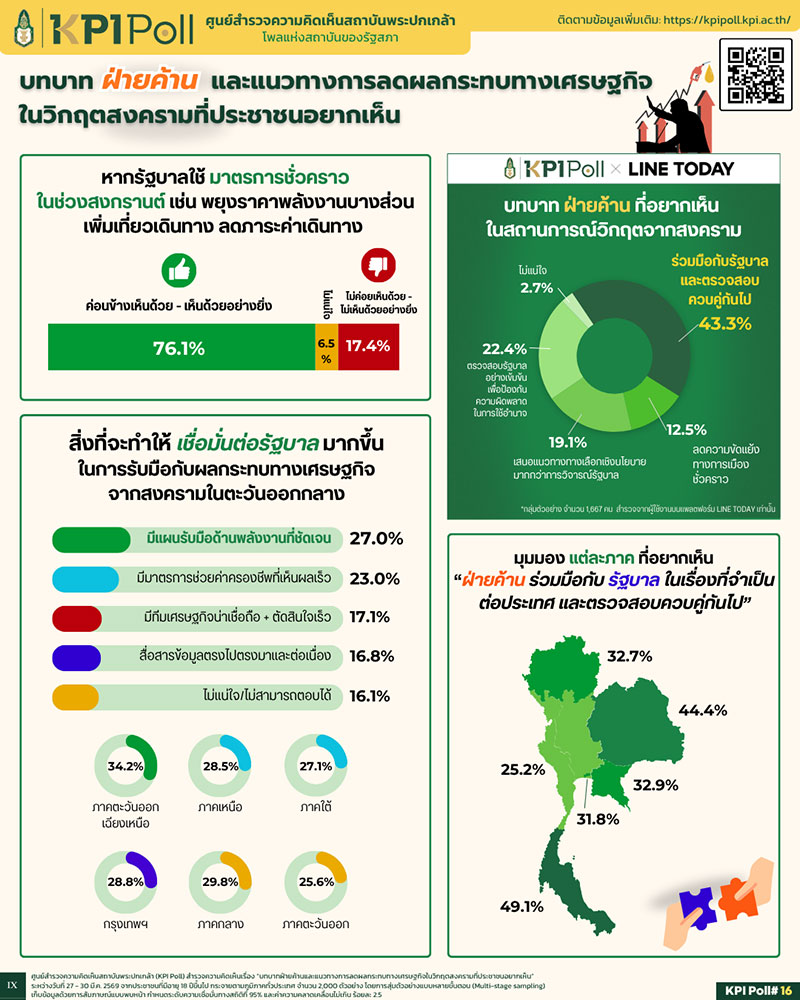 การแถลงผลการสำรวจ KPI Poll ครั้งที่ 16 ที่ศูนย์ฯ ได้ทำการสำรวจ ระหว่างวันที่ 27 - 30 มี.ค. 2569 จากประชาชนที่มีอายุ 18 ปีขึ้นไป กระจายตามภูมิภาคทั่วประเทศ จำนวน 2,000 ตัวอย่าง โดยมีบทสรุปสำคัญจากผลสำรวจ ดังนี้