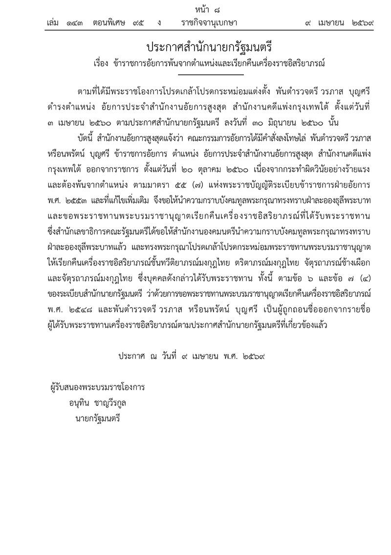 บัดนี้ สำนักงานอัยการสูงสุดแจ้งว่า คณะกรรมการอัยการได้มีคำสั่งลงโทษไล่ พันตำรวจตรี วรภาส หรือนพรัตน์ บุญศรี ข้าราชการอัยการ ตำแหน่ง อัยการประจำสำนักงานอัยการสูงสุด สำนักงานคดีแพ่งกรุงเทพใต้ ออกจากราชการ ตั้งแต่วันที่ 20 ตุลาคม 2560 เนื่องจากกระทำผิดวินัยอย่างร้ายแรงและต้องพ้นจากตำแหน่ง ตามมาตรา 55 (7) แห่งพระราชบัญญัติระเบียบข้าราชการฝ่ายอัยการ พ.ศ. 2553 และที่แก้ไขเพิ่มเติม จึงขอให้นำความกราบบังคมทูลพระกรุณาทรงทราบฝ่าละอองธุลีพระบาทและขอพระราชทานพระบรมราชานุญาตเรียกคืนเครื่องราชอิสริยาภรณ์ที่ได้รับพระราชทาน ซึ่งสำนักเลขาธิการคณะรัฐมนตรีได้ขอให้สำนักงานองคมนตรีนำความกราบบังคมทูลพระกรุณาทรงทราบฝ่าละอองธุลีพระบาทแล้ว และทรงพระกรุณาโปรดเกล้าโปรดกระหม่อมพระราชทานพระบรมราชานุญาตให้เรียกคืนเครื่องราชอิสริยาภรณ์ชั้นทวีติยาภรณ์มงกุฎไทย ตริตาภรณ์มงกุฎไทย จัตุรถาภรณ์ช้างเผือก และจัตุรถาภรณ์มงกุฎไทย ซึ่งบุคคลดังกล่าวได้รับพระราชทาน ทั้งนี้ ตามข้อ 6 และข้อ 7 (4) ของระเบียบสำนักนายกรัฐมนตรี ว่าด้วยการขอพระราชทานพระบรมราชานุญาตเรียกคืนเครื่องราชอิสริยาภรณ์ พ.ศ. 2548 และพันตำรวจตรี วรภาส หรือนพรัตน์ บุญศรี เป็นผู้ถูกถอนชื่อออกจากรายชื่อผู้ได้รับพระราชทานเครื่องราชอิสริยาภรณ์ตามประกาศสำนักนายกรัฐมนตรีที่เกี่ยวข้องแล้ว