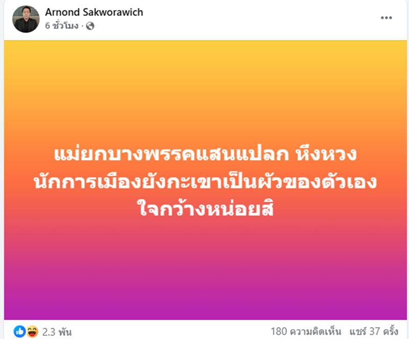 วันที่ 11 เมษายน 2569 ผศ.ดร.อานนท์ ศักดิ์วรวิชญ์ อาจารย์ประจำคณะสถิติประยุกต์ สถาบันบัณฑิตพัฒนบริหารศาสตร์ (นิด้า) โพสต์ข้อความผ่านเฟซบุ๊ก Arnond Sakworawich ระบุสั้นๆว่า แม่ยกบางพรรคแสนแปลก หึงหวงนักการเมืองยังกะเขาเป็นผัวของตัวเอง ใจกว้างหน่อยสิ