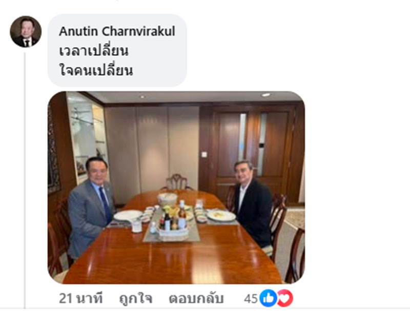 ล่าสุด นายอนุทิน ชาญวีรกูล นายกรัฐมนตรีและรมว.มหาดไทย ได้เข้ามาคอมเมนต์ด้วยว่า "เวลาเปลี่ยน ใจคนเปลี่ยน" พร้อมภาพถ่ายร่วมกับนายอภิสิทธิ์ เวชชาชีวะ หัวหน้าพรรค ปชป.