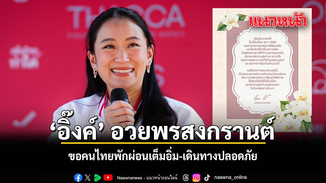 วันนี้ 13 เมษายน 2569 ที่ผ่านมา อิ๊งค์ แพทองธาร ชินวัตร ได้โพสต์ภาพการ์ดอวยพรพร้อมข้อความผ่านเฟซบุ๊กส่วนตัว เพื่อส่งความปรารถนาดีไปยังพี่น้องประชาชนชาวไทยเนื่องในเทศกาลสงกรานต์ โดยมีข้อความทั้งหมดระบุว่า "เนื่องในวาระดิถีขึ้นปีใหม่ไทย พ.ศ. 2569 ขออาราธนาคุณพระศรีรัตนตรัยและสิ่งศักดิ์สิทธิ์ในสากลโลก โปรดดลบันดาลให้ท่านและครอบครัวประสบแต่ความสุขกาย สบายใจ มีสุขภาพพลานามัยที่แข็งแรงสมบูรณ์ และปราศจากโรคภัยทั้งปวงค่ะ