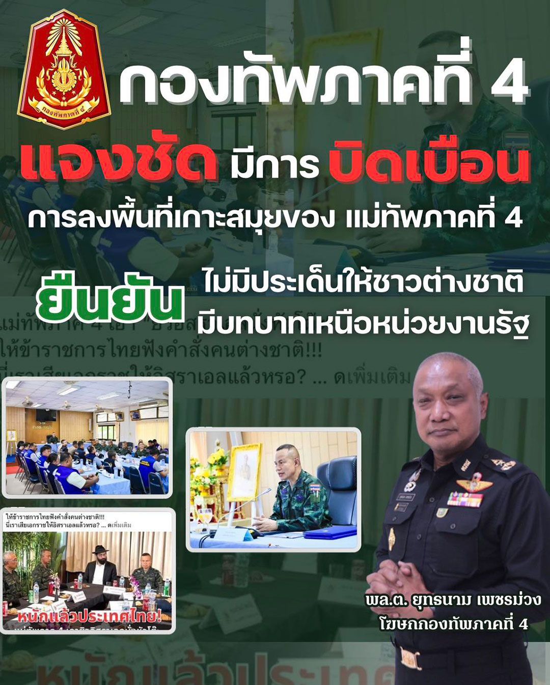 โฆษกกองทัพภาคที่ 4 ชี้แจง กรณีปรากฏข้อมูลในสื่อสังคมออนไลน์บางสำนัก เผยแพร่ข้อความบิดเบือนเกี่ยวกับการลงพื้นที่ของ แม่ทัพภาคที่ 4 ในพื้นที่อำเภอเกาะสมุย และอำเภอเกาะพะงัน จังหวัดสุราษฎร์ธานี เมื่อวันที่ 15 เมษายน 2569 ที่ผ่านมา โดยระบุ “ให้ชาวอิสราเอลนั่งหัวโต๊ะสั่งการข้าราชการไทย” ซึ่งเป็นข้อมูลที่คลาดเคลื่อนจากข้อเท็จจริงโดยสิ้นเชิง