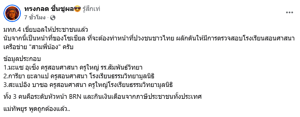 นับจากนี้เป็นหน้าที่ของโซเชียล ที่จะต้องทำหน้าที่ปวงชนชาวไทย ผลักดันให้มีการตรวจสอบโรงเรียนสอนศาสนา เครือข่าย "สามพี่น้อง" ครับ