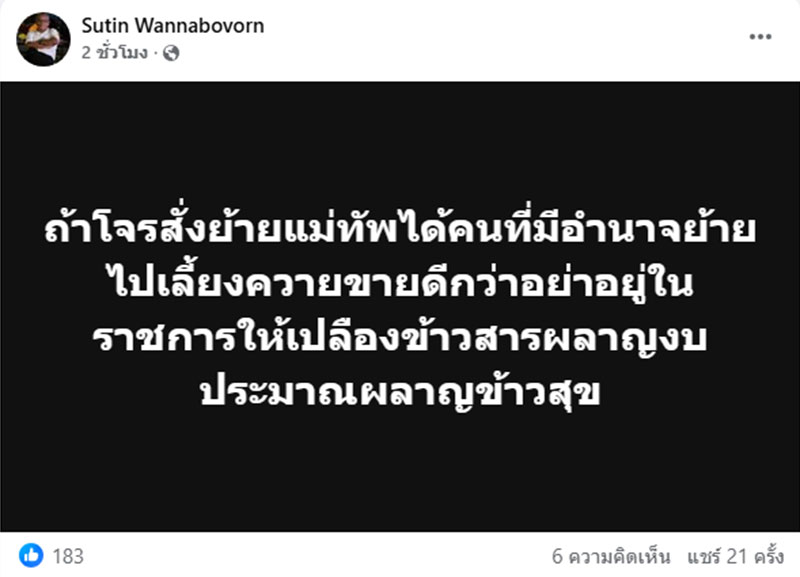 ล่าสุด นายสุทิน วรรณบวร อดีตผู้สื่อข่าวสำนักข่าวต่างประเทศ โพสต์ข้อความบนเฟซบุ๊กถึงเรื่องนี้ว่า ถ้าโจรสั่งย้ายแม่ทัพได้ คนที่มีอำนาจย้ายไปเลี้ยงควายขายดีกว่า